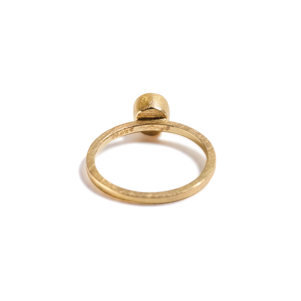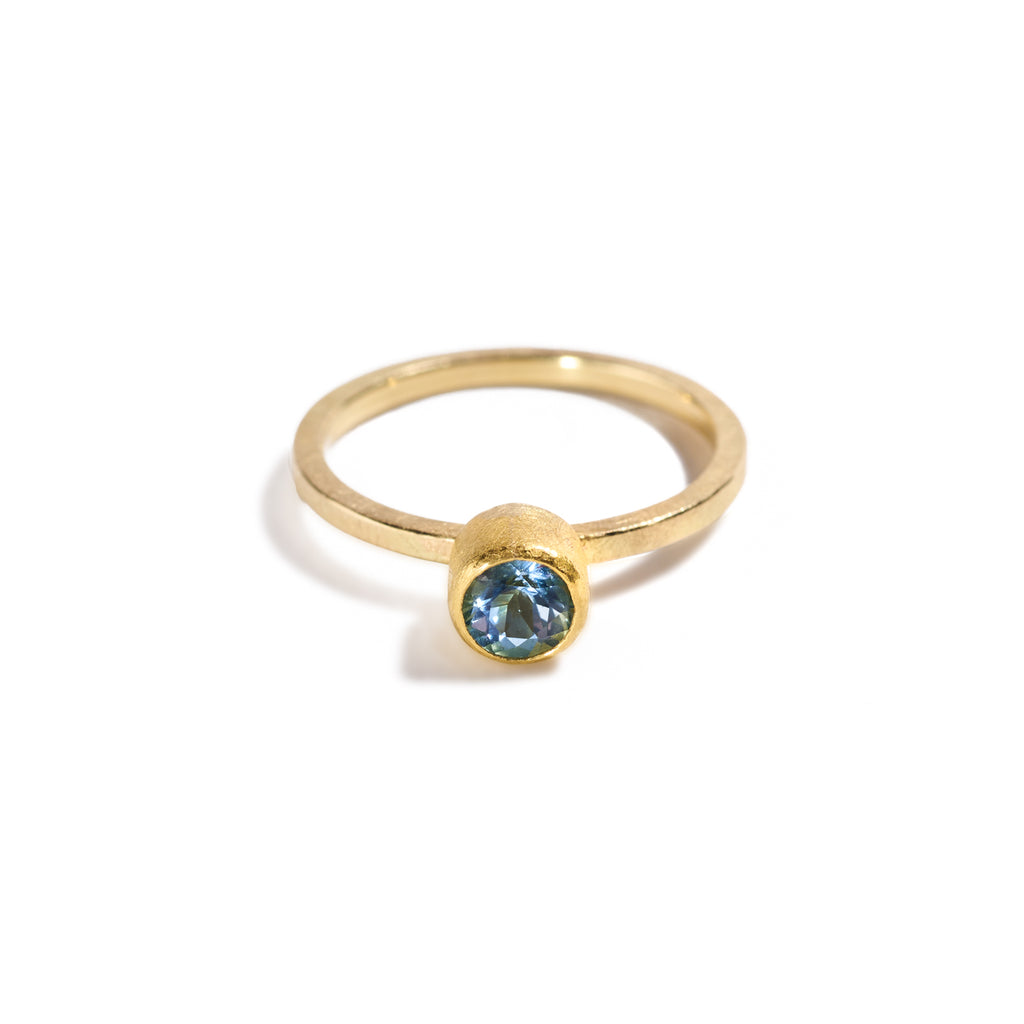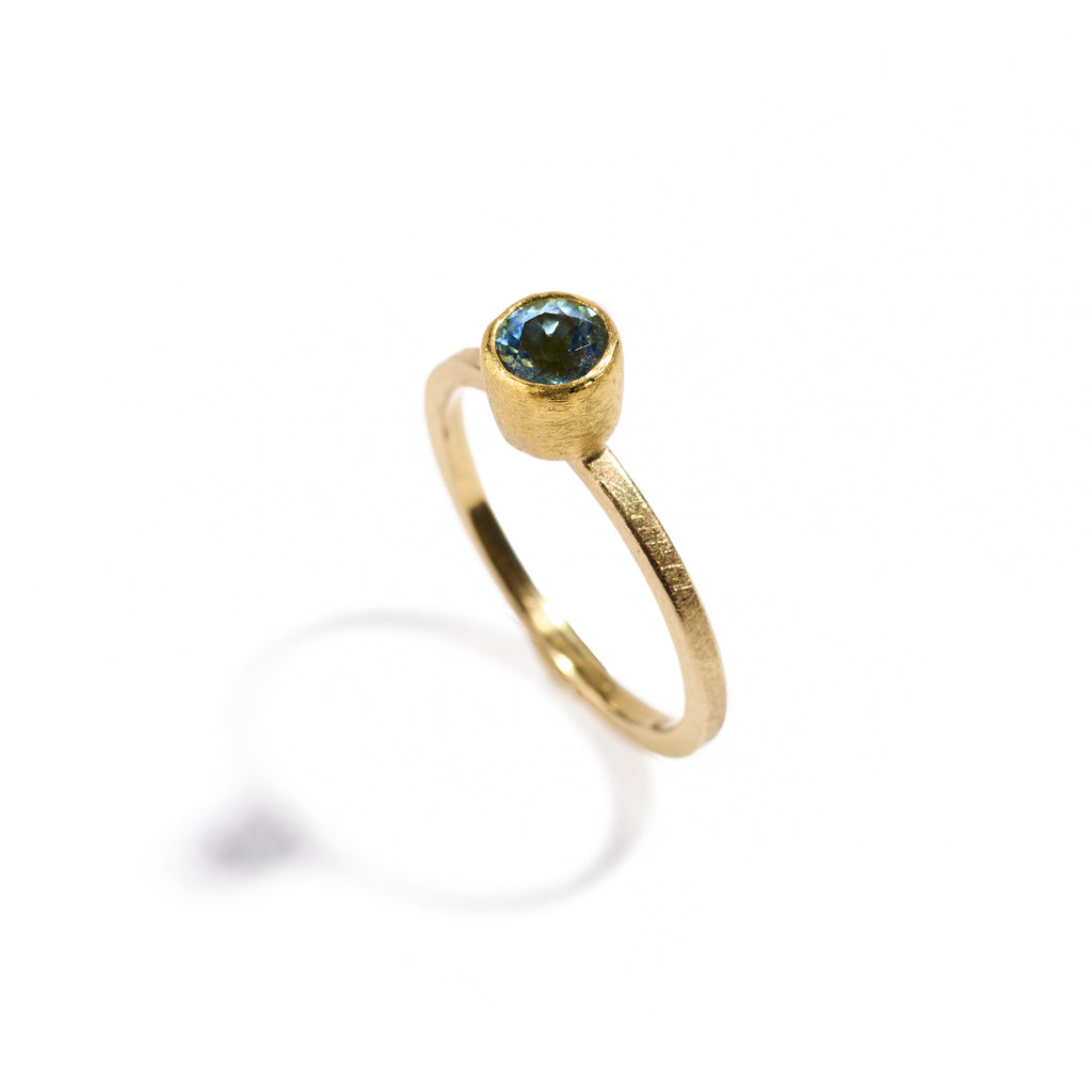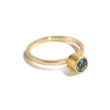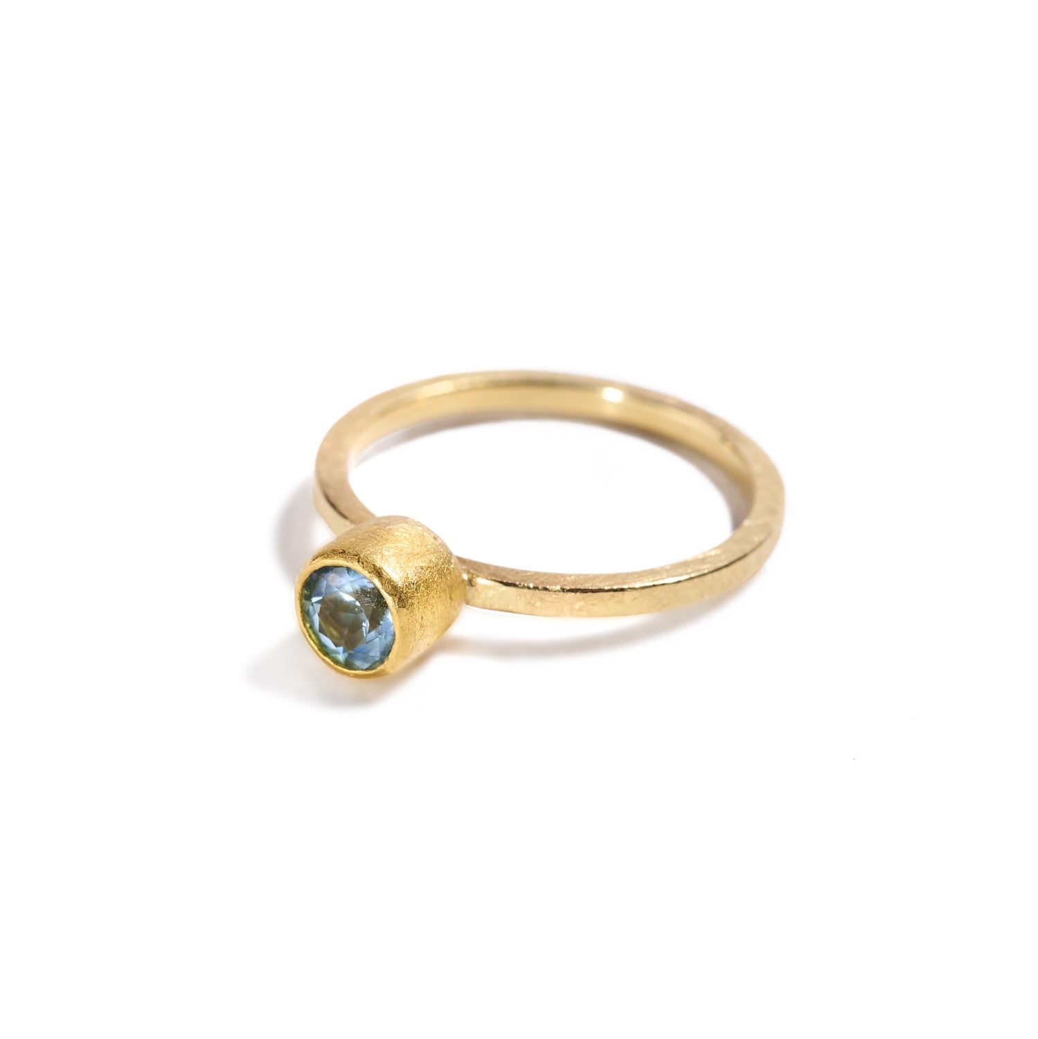 Creating a harmonious balance of texture, color, and form, this ring by Petra Class is a testament to her skill and passion for creating jewelry that resonates with simplistic elegance. At the heart, lies a stunning faceted aquamarine, a gemstone revered for its tranquil blue hue that evokes images of the clear sky and serene ocean waves. Cased in a rich luster of gold, the blue tones dance across its surface and reflect its soft, luminous tones. The subtle texture of the gold adds depth and dimension, complementing the sparkle of the aquamarine, giving the ring a modern, understated elegance.