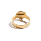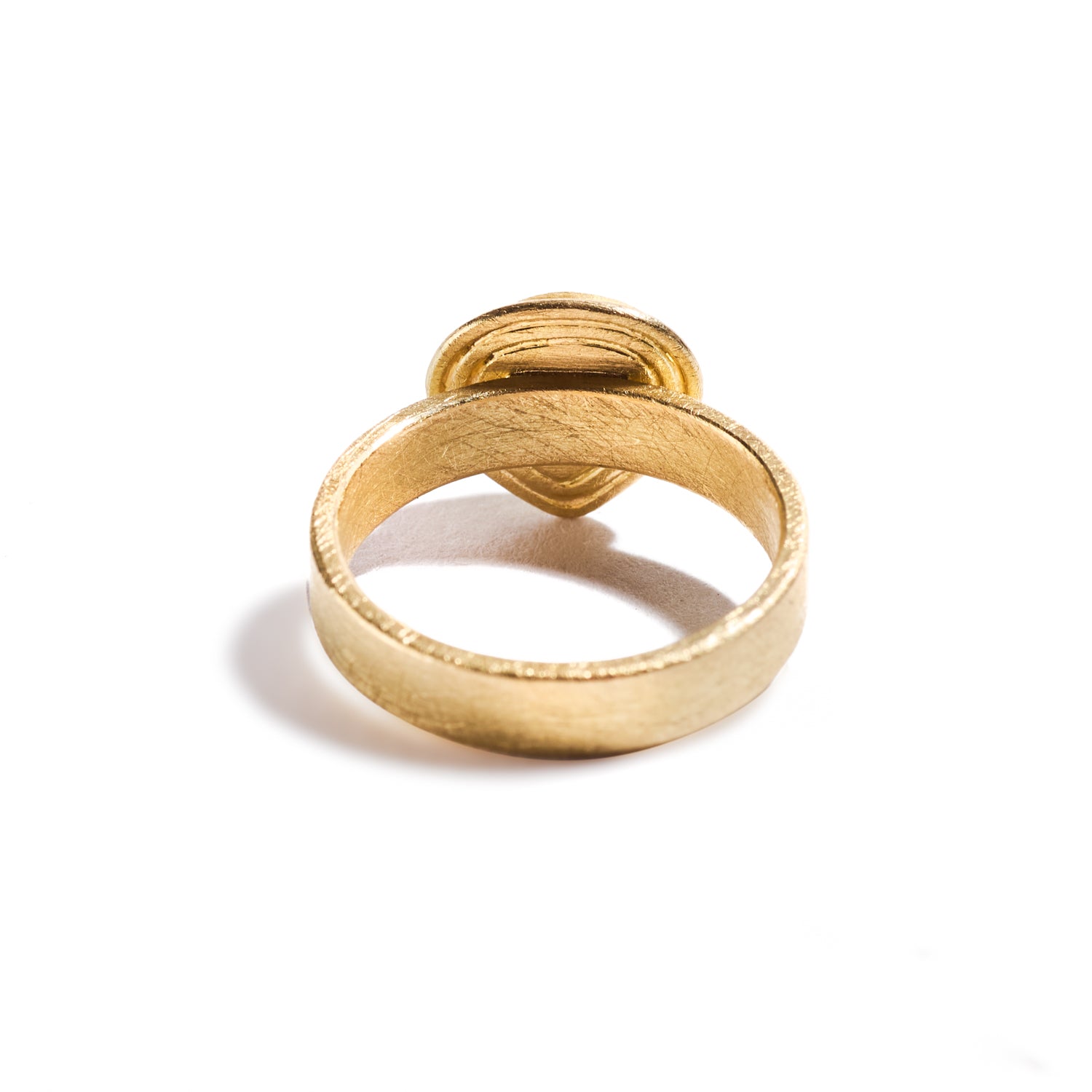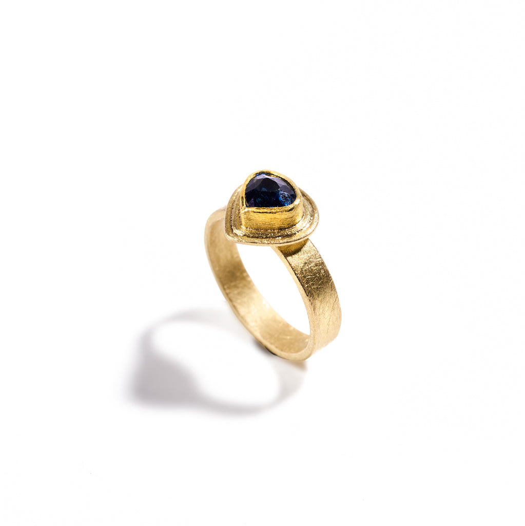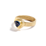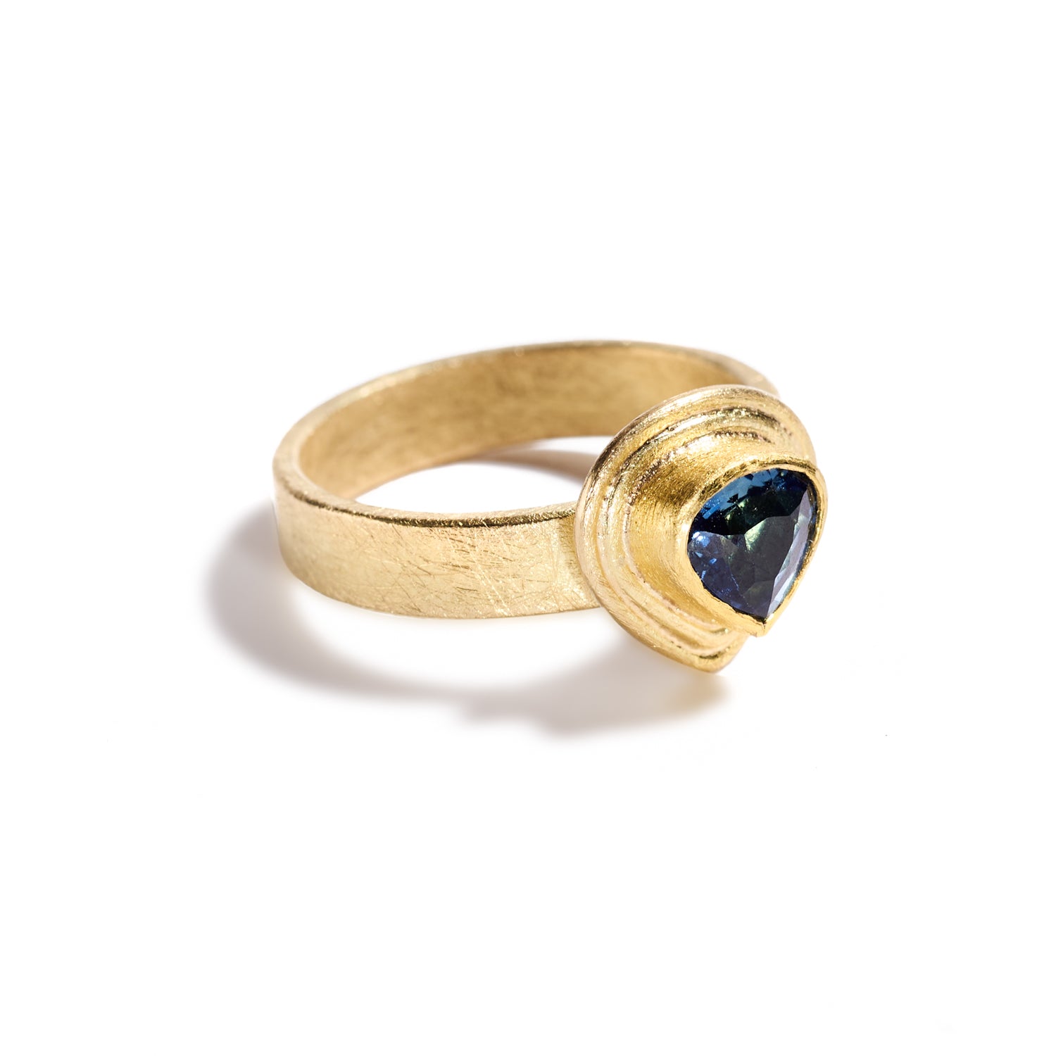 An alluring expression of beauty, one Sri Lankan blue sapphire emerges from the graceful frame of high karat gold. In this design, Class masterfully coaxes the gold into flattering layers to expel the structure she desires. Arising to the surface is a deeply saturated, near Aegean blue. The piece originates from a quiet complexity and matures into pure, yet subtle splendor. Admire and adorn for any soul-stirring engagement.