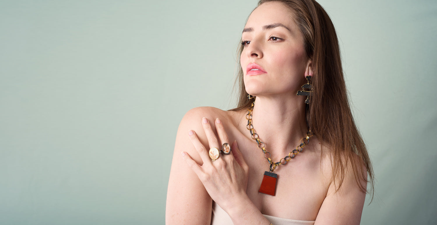 As shown with: 18" Gold and Silver Hammered Link Chain, Jasper Pendant, Oxidized Vertical Lodolite Quartz Ring, Wyoming Jade Tiered Earrings.