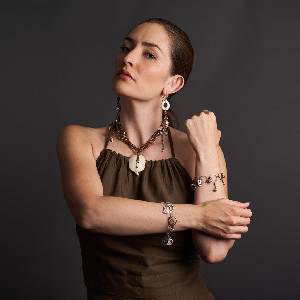 This whimsical bracelet by Lucia Antonelli is a fun interplay of elegance and craftsmanship. Featuring interlocking sterling silver links, the artist crafts delicate 18K gold accents that are strategically placed, adding warmth and a touch of luxury to the cool silver tones. The bracelet’s design balances bold structure with fluid movement, ensuring a comfortable fit and timeless appeal. Perfect for any occasion, its versatile aesthetic effortlessly complements casual and formal ensembles. A hallmark of Lucia Antonelli’s artistry, this bracelet embodies understated sophistication and impeccable attention to detail.