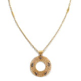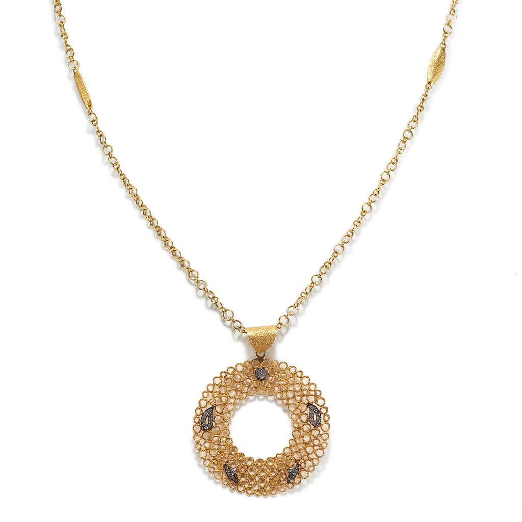 Light delicacy married with opulent distinction permeates through this piece by Noor. The flowing Hawa, or wind, travels through the glowing intricacies of the pendant, creating a detailed statement upon the body. Sophisticated design is beautifully balanced within the varying, yet subtle hues of gold. Emboldened by the continuity of circular disposition, the grander form is built upon by that of tiny curvaceous, golden forms, composing a piece of intricate beauty. Dark golden figures dance in the open area of the glowing pendant, enticing our eye with it's quiet sense of intrigue. A dignified work that is astoundingly agile to behold, this pendant is the dynamic elegance you've been looking for.