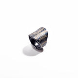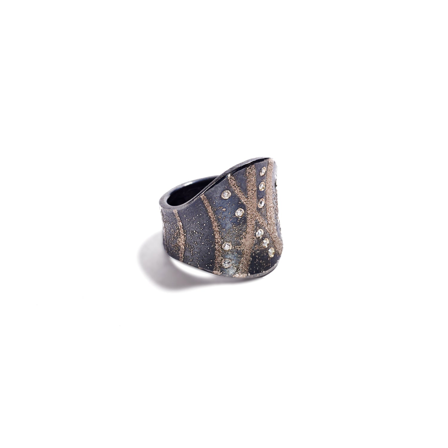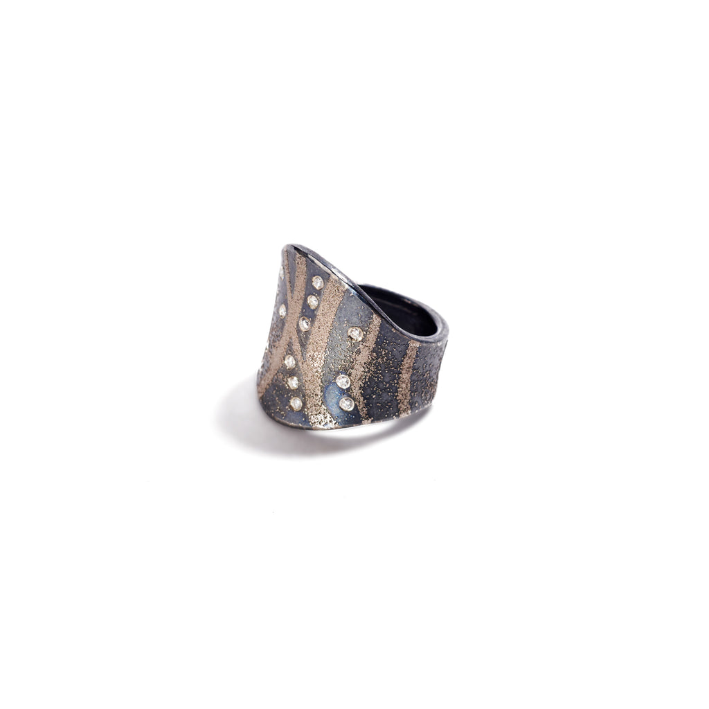 Masterfully made to fit the form of your finger, Peter Schmid of Atelier Zobel shines once again among his collection of elegant rings. Across a darkened plane of sterling silver, hints of platinum dash across the surface. Murmurs of movement softly collide with a constellation of diamonds collecting smoothly in a sparkling array of beclouded perfection. Exquisite comfort, moving with the organic curvature of the finger while balancing slim, handsome grace of form& design, Schmid achieves a level of opulence at inequivalent proportions