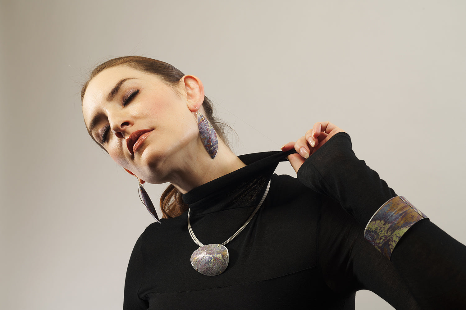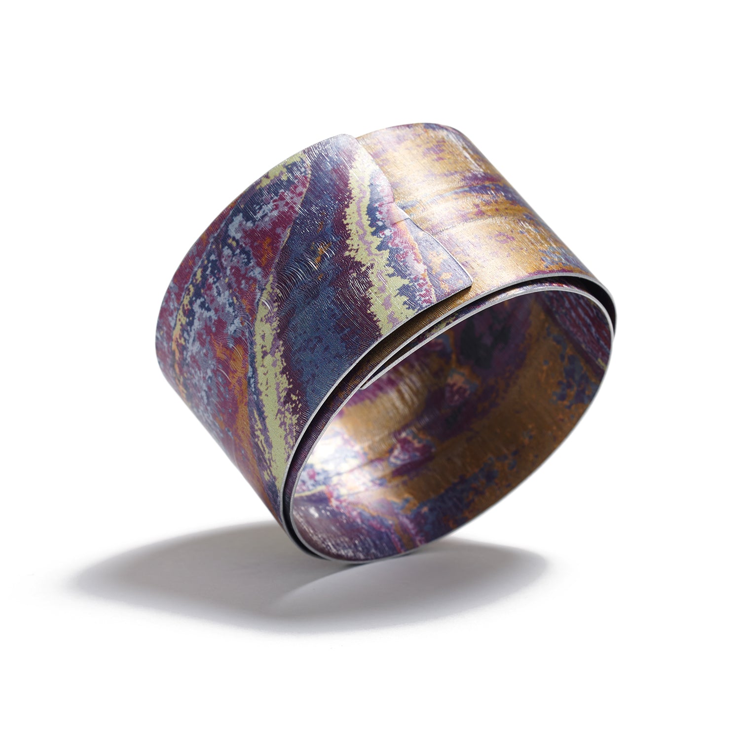 Undergoing the process of creating an exceptional, durable finish, Jane Adam artfully constructs exquisite works of art from aluminum. The finishing result is a complexity of color that exudes vibrancy and eloquence upon the body. Lightly, one may tug at the form to expand and pleasantly pull the piece over the hand and around the wrist. The piece is an elegant fixture as it gracefully wraps itself in place. Quite a fine expression of soul-stirring adornment.