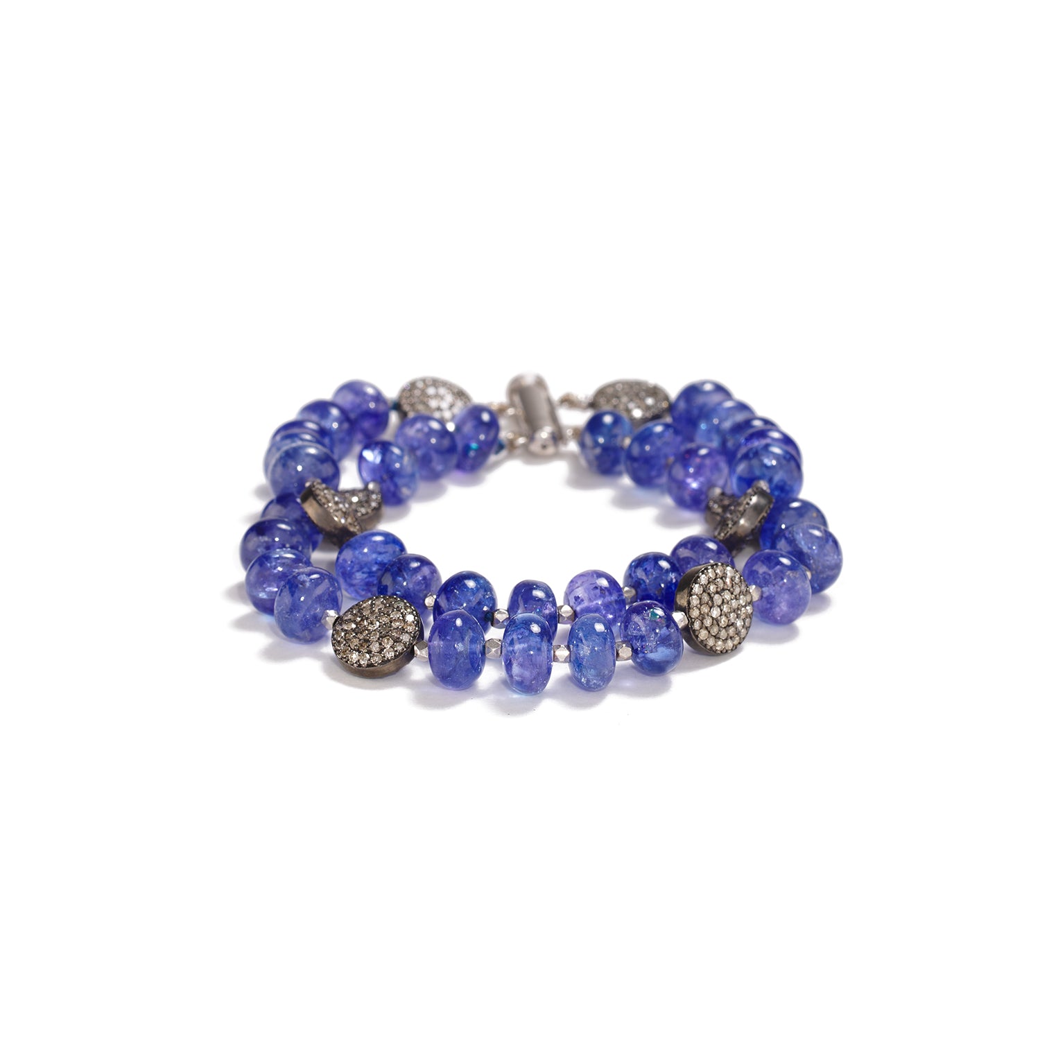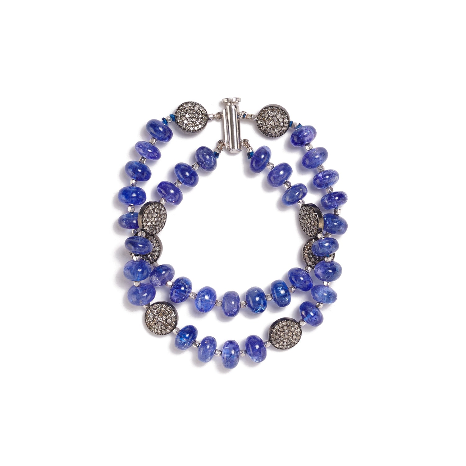 Oxidized sterling silver, 18K white gold, tanzanite beads 122cts, diamonds pave