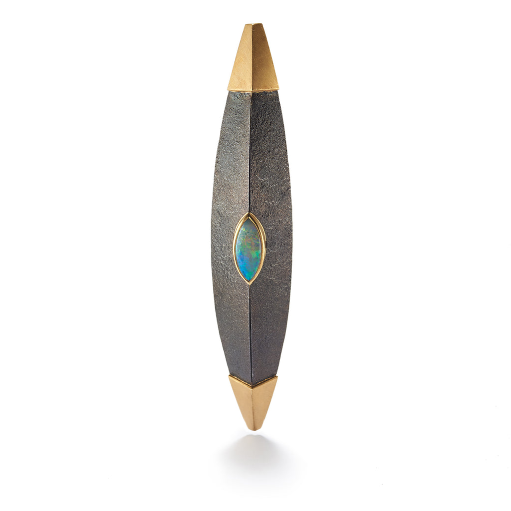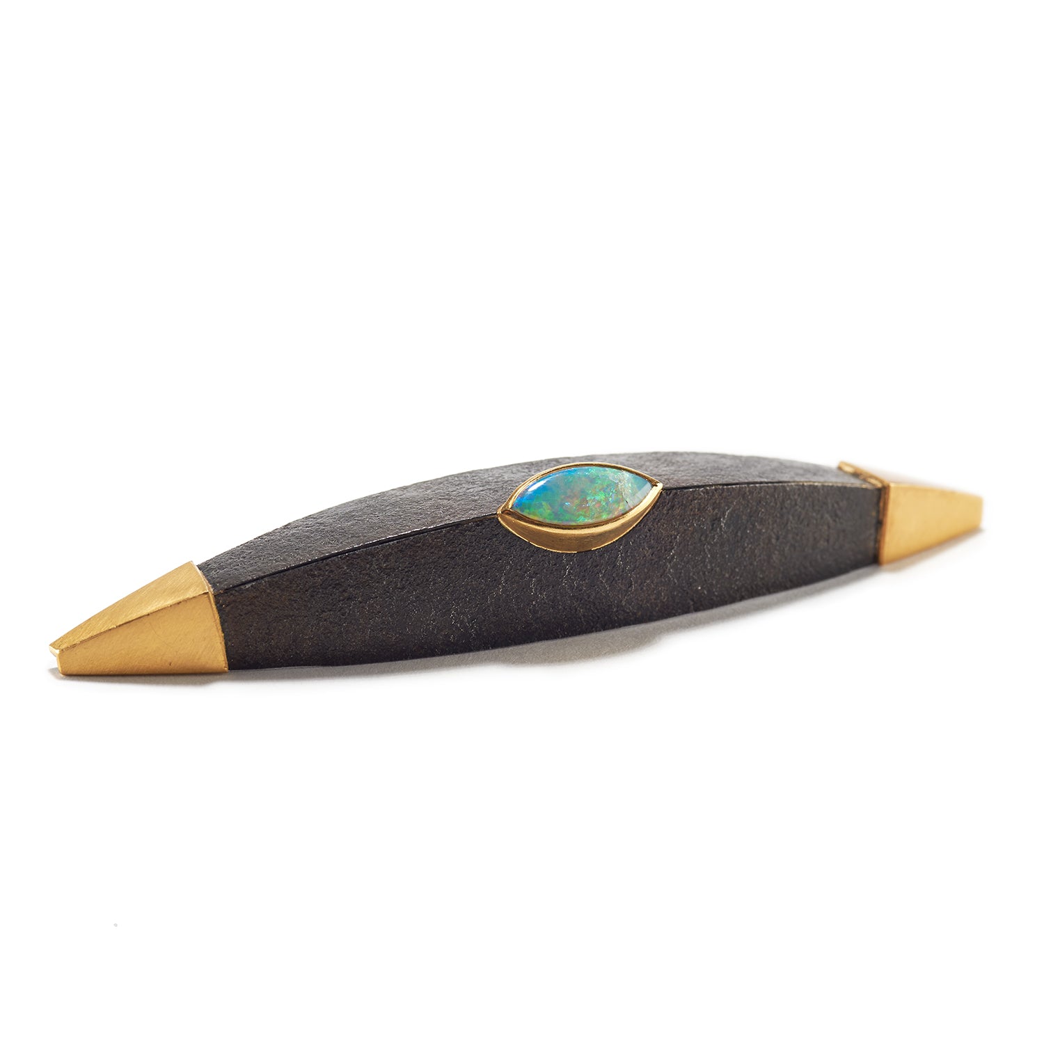 Master maker, Pat Flynn has created a signature piece in iron and gold with a single fiery opal at it's center. In the shape of a marque, he skillfully entices our gaze at its seemingly folded center. With striking form, the way the maker constructed this brooch dazzles one's sight as one notices that the luminous opal lives betwixt its cornered edge ever so seamlessly. The stone, cradled in high karat gold, is nicely contrasted to the deep body of iron, which again, with dynamic ingenuity is coaxed to Flynn's artful intention. Gracefully positioned on the outer perimeter of the piece are corners graciously endowed in gold, eloquently balancing his overarching work. With extraordinary skill and careful design, Flynn astounds the mind with intoxicating interest, expanding to his array of material and technique to create a monumental work of art.
