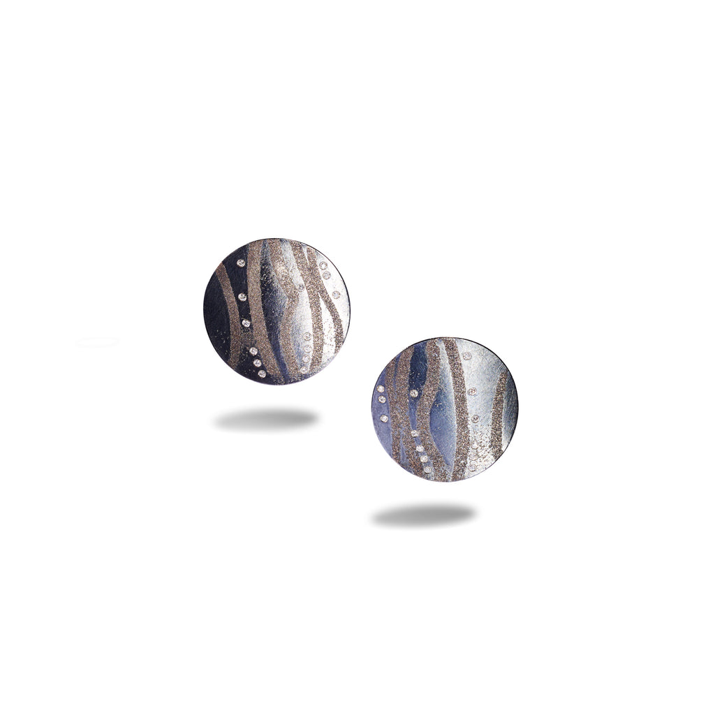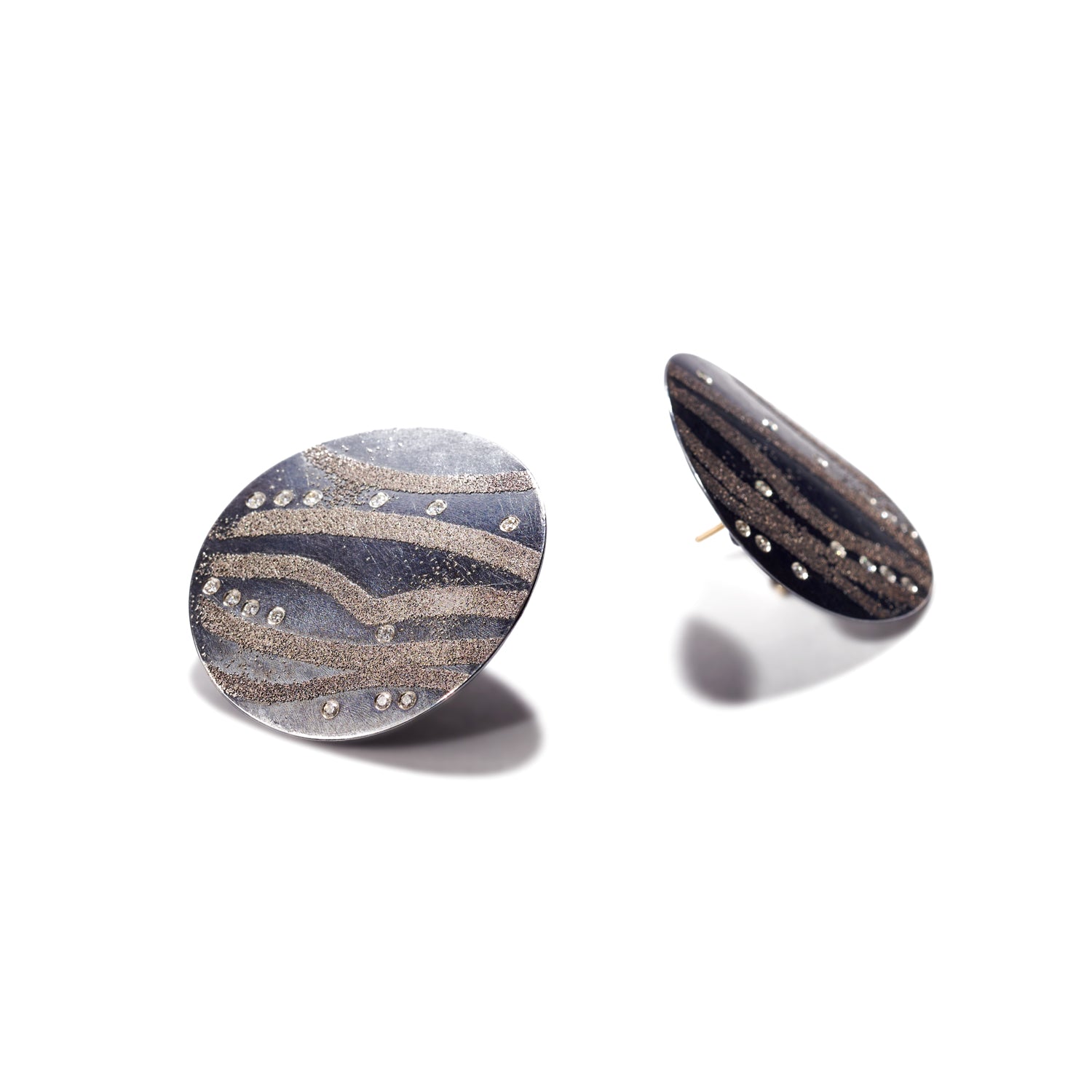 A sensuous explosion of master metalsmithing creates a dynamic earring ensemble for the body. Schmid measures area and space to create a stunning spray of high karat gold and platinum across a deep sea of silver. Within its opulent waves is a sprinkling of white diamonds. Once worn, admire the comfort of his craftsmanship and the brilliant lure of the design. Expertly made to be worn and treasured for your most soul-stirring engagements.