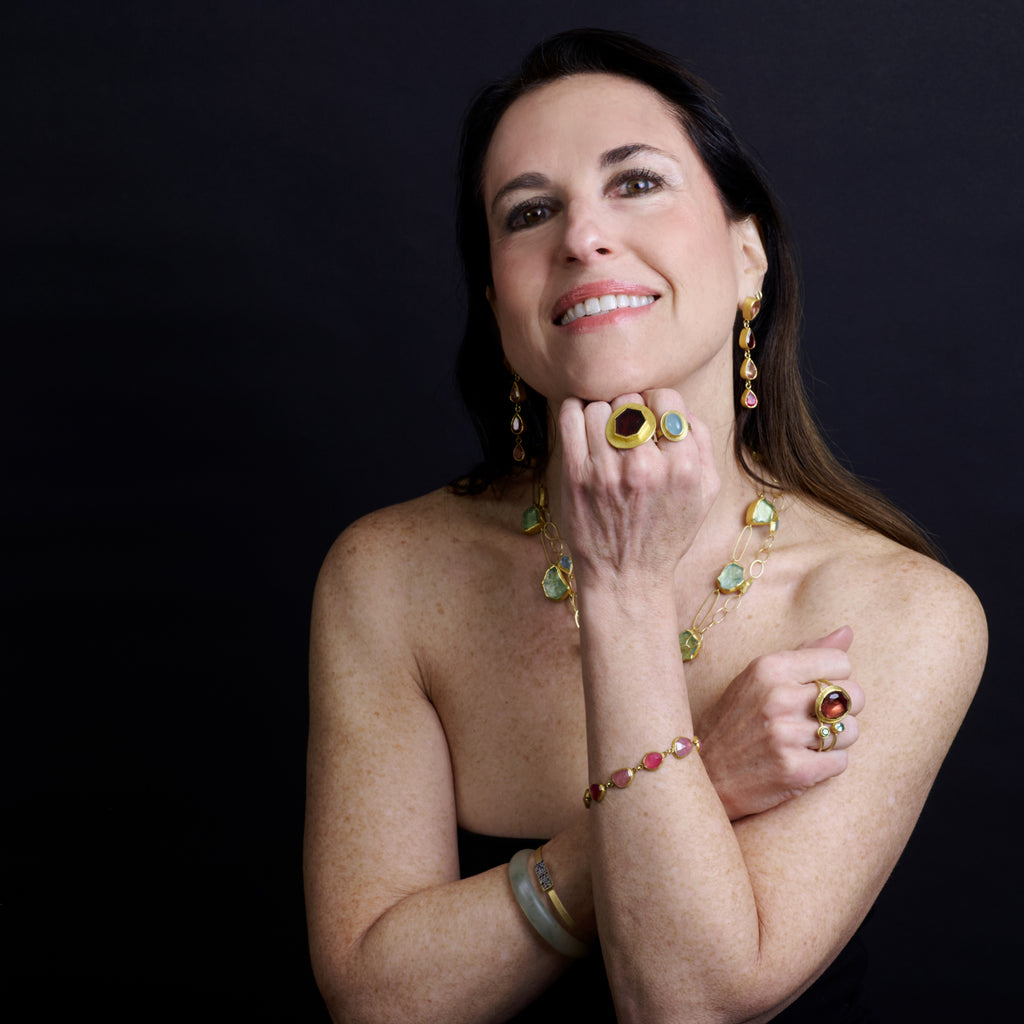Shown with: Aqua Crystal Necklace, Pink and Red Tourmaline Drop Earrings, Aquamarine On Oval Link Chain, Blue Sapphire Bangle, Oval Cabochon Aquamarine Ring, Red Hexagon Garnet Ring, Red Tourmaline Ring, Oval Sapphire Ring, Round Faceted Aquamarine Ring, and Green Tourmaline Stacking Ring.