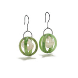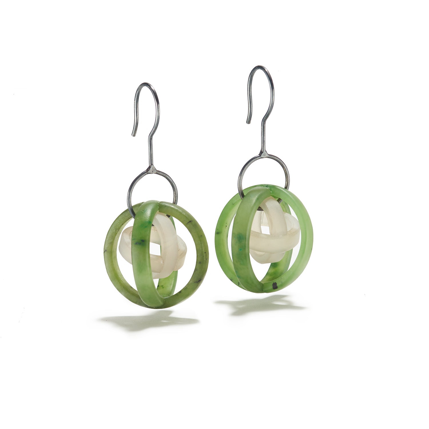 Within a tantalizing sphere of deep jade, a smaller globe of milky white agate lives at its core. Gracefully, the forms in both volume and color compliment one another in space to comprise maker, Pia Groh's artful composition. Stirring fanciful curiosity, she captures our attention with masterful skill of design and ingenuity. With an acute attention to the circular nature of the material, Groh loses herself in the repetitive motions of the stones and refined, darkened tones of oxidized sterling silver. Once worn, the piece rests upon the lobe as a striking sculpture nearly as stunning as the figure who adorns it. Light as a feather, yet one of beauteous dynamism. With admiration for elegant minimalism, Groh creates a work that is as delightful to behold as it is versatile to wear, infused with a soft beauty to truly stir your soul.