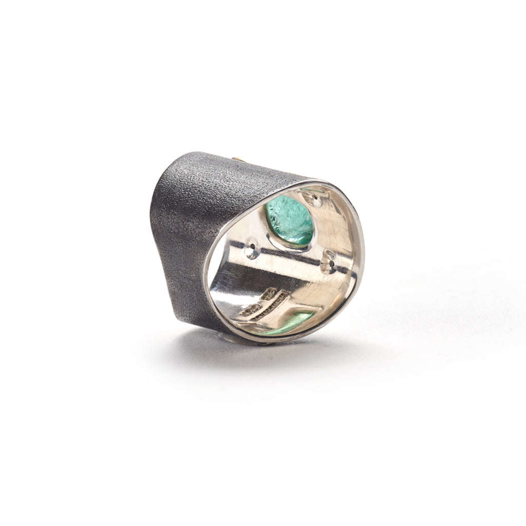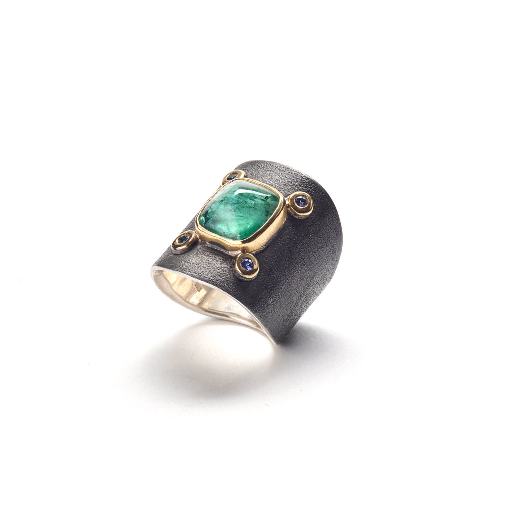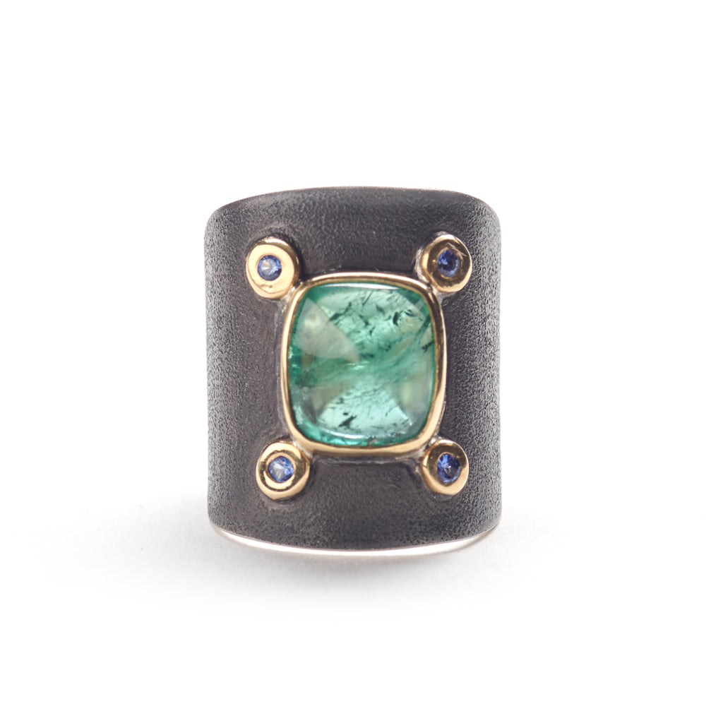 22K yellow gold, oxidized sterling silver, cabochon indicolite tourmaline 5.1cts, royal blue sapphires