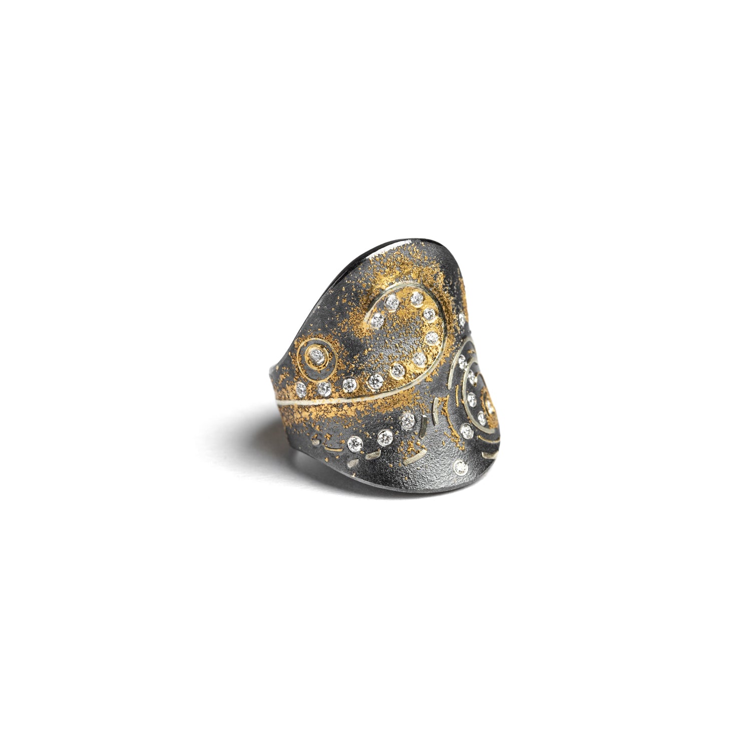 Paying homage to Vincent Van Gogh and his masterpiece "Starry Night", Schmid uniquely captures the depth and infinity of the night sky in this ring. Swirls of high karat gold emulate the swirling stars and luminous celestial bodies in the painting while white surface set diamonds are sprinkled across the piece, imbuing the work with the sparkling vitality of his ingenious work of art. Gracefully, the ring is made with expert curvature and shape for any occasion.