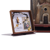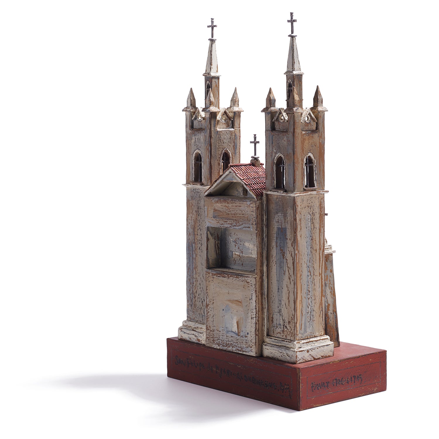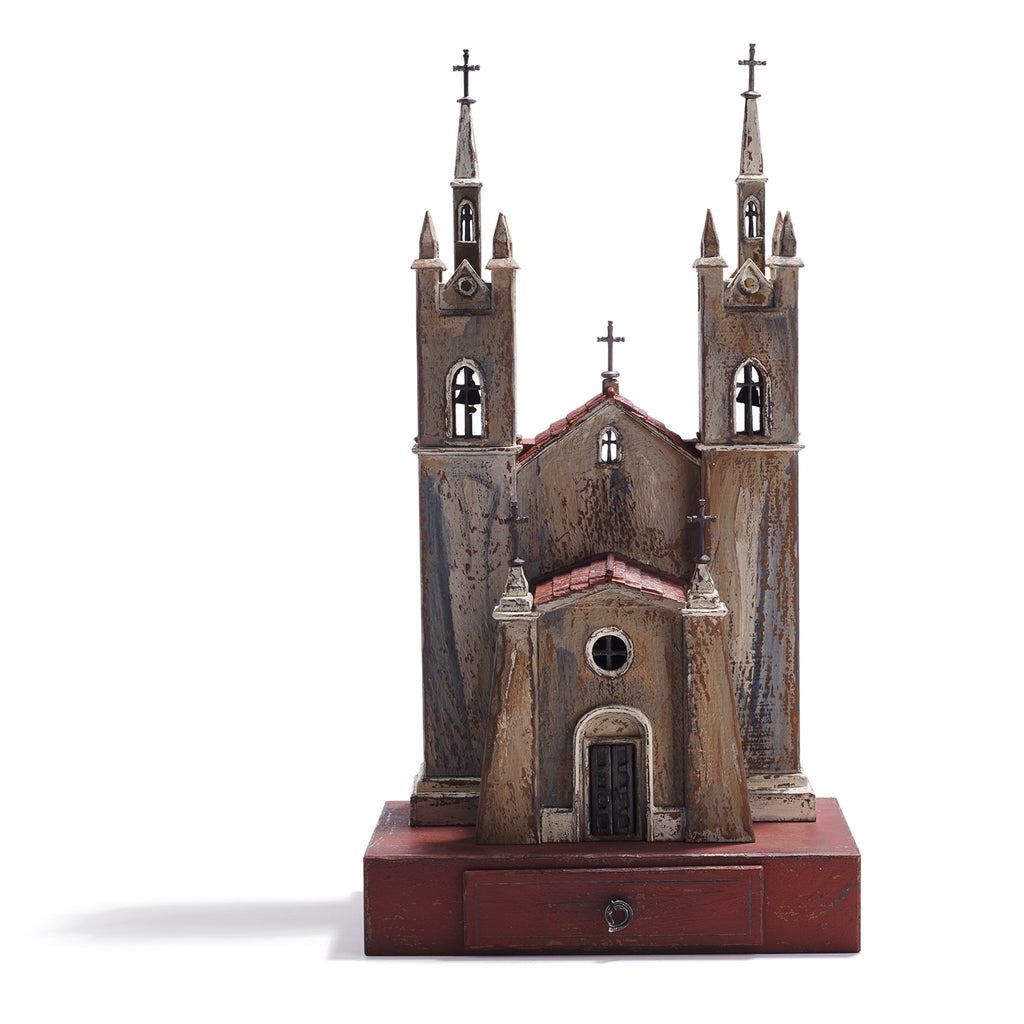Simple yet profound, the artist's interpretation of the chapel honors the site for the spiritual revelation that it is. Cardinale captures several elements that nod to the original chapel including its layered rooflines and the soft mixtures of color and texture. He also sculpts the vivid likeness of exterior embellishments including a functional miniature door and swaying bells. All expertly and exquisitely honor scale and proportion.