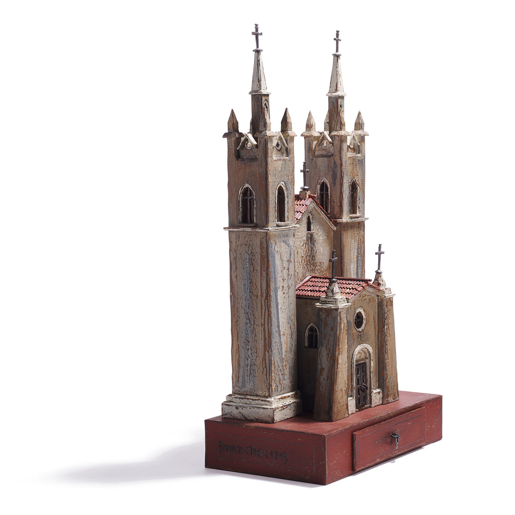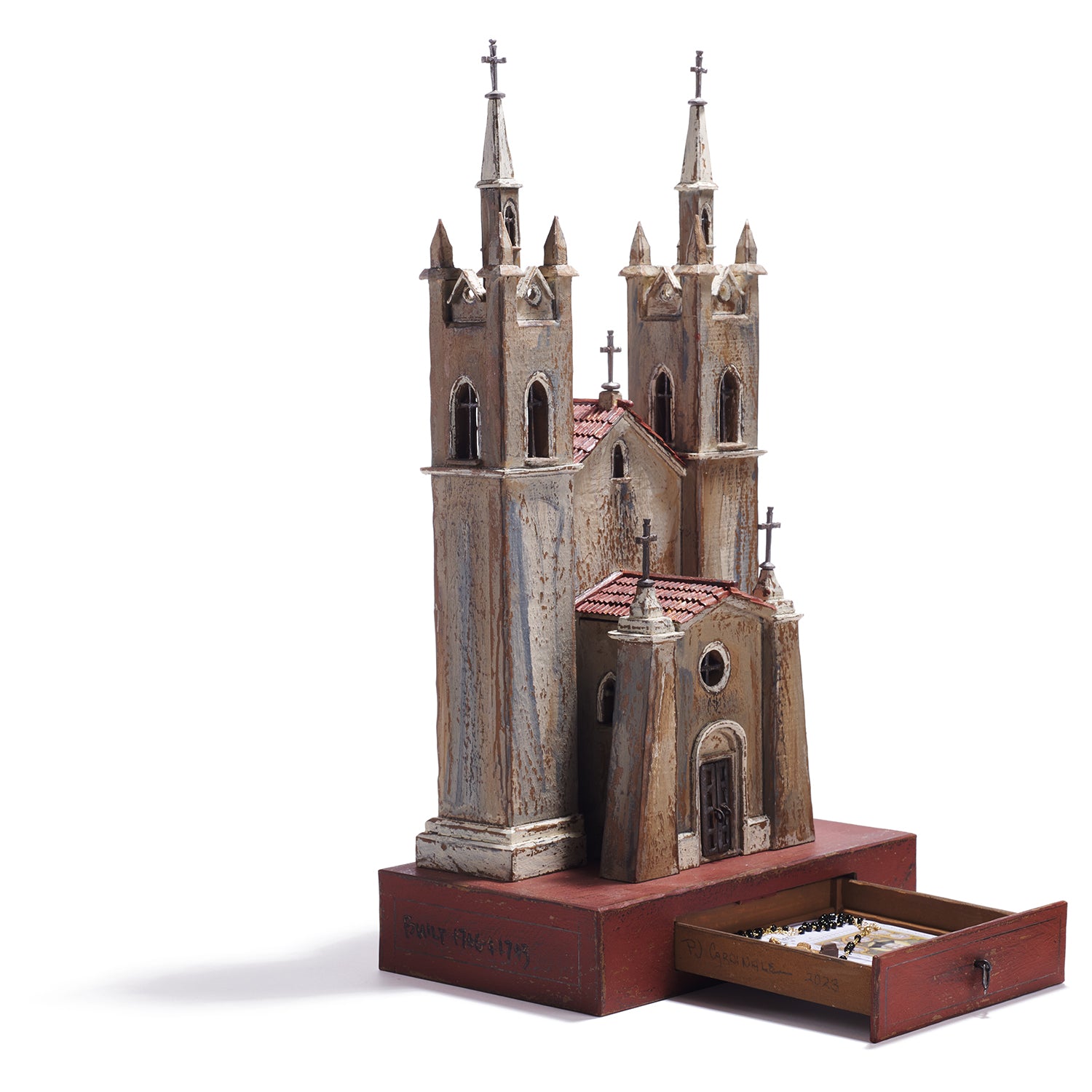 Cardinale finishes the composition with a drawer on the front of the piece. Upon opening, Cardinale’s wife PJ, of 56 years, composes a mix-media collage paying homage to the church.