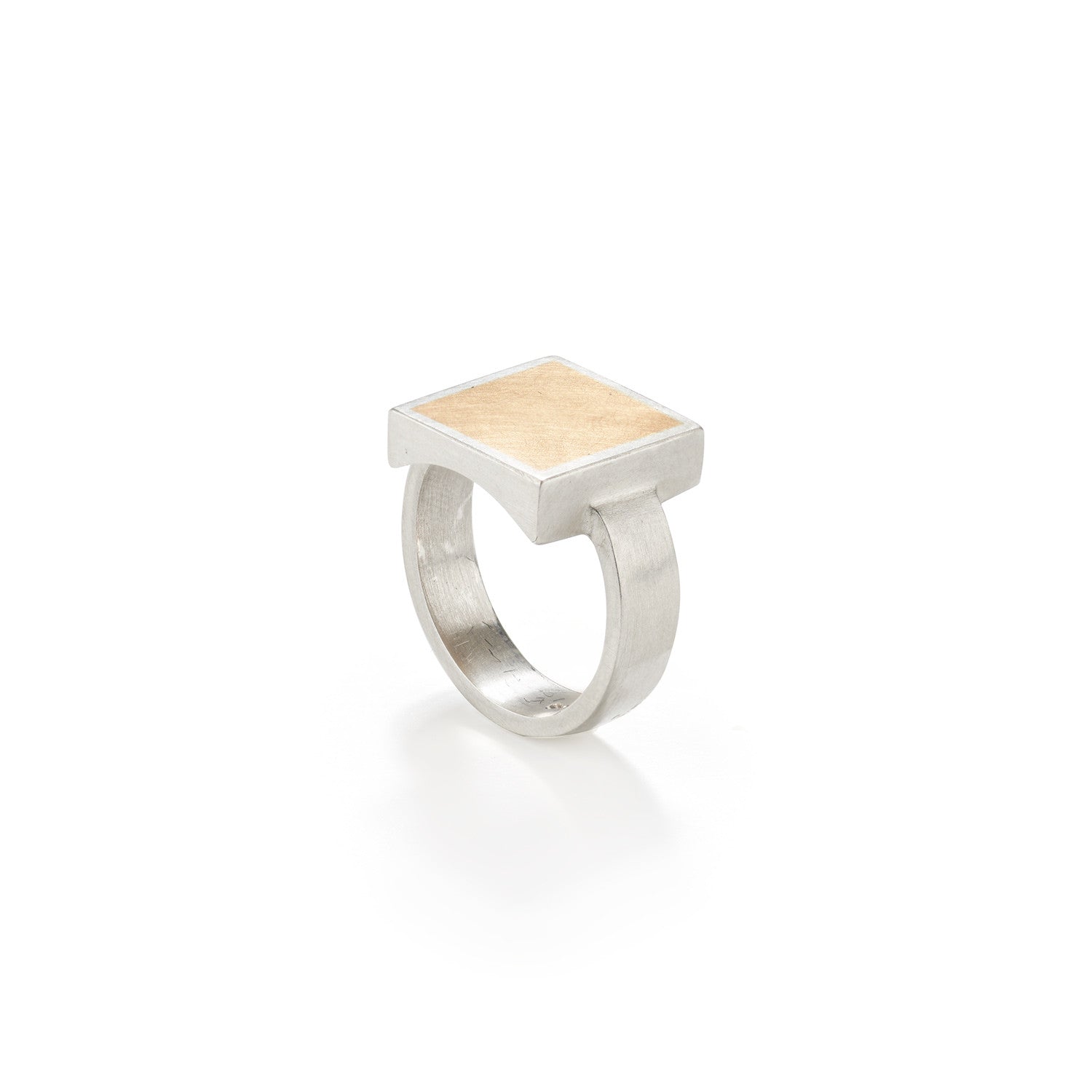 A square structure and convenient scale make this modern, mixed metal ring a go to piece for every day.