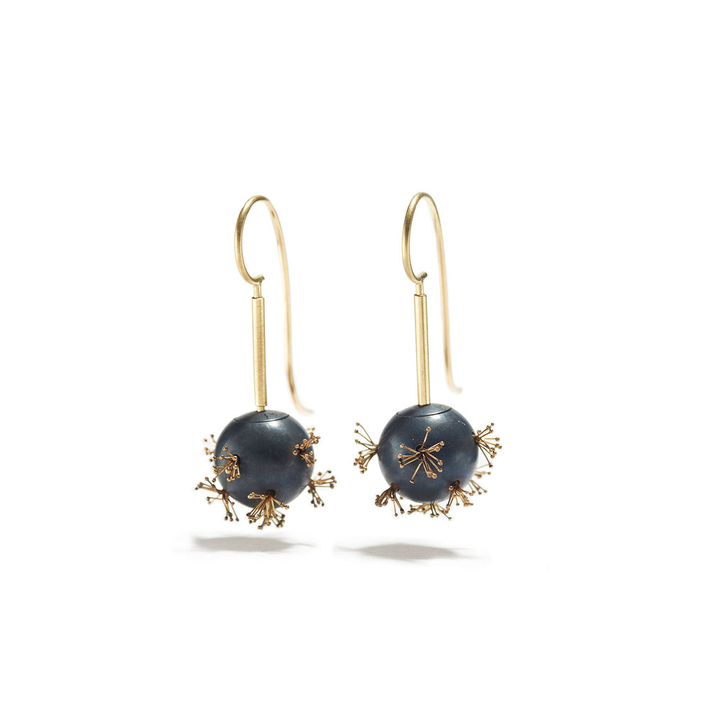 From spheres of oxidized sterling silver, artist Susanne Elstner creates a composition charmed by the lustrous animation of high karat gold.