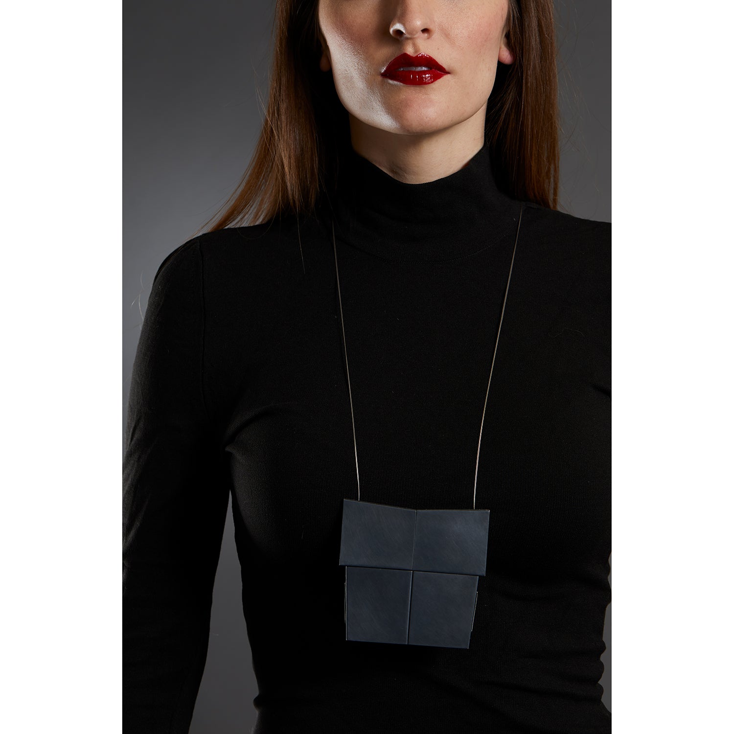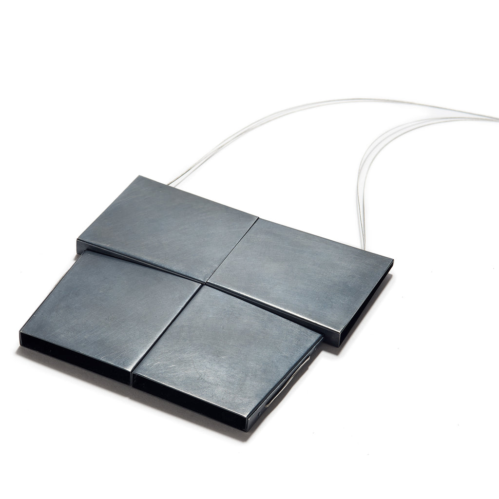 Valentine Dubois masterfully creates forms in oxidized sterling silver and turns them into compositions of artful proportion. Beginning with planes of silver, she skillfully persuades the metal into folded, rectangular bearings. For this composition, she then takes two rectangular pieces and inserts a lengthened, narrow slice of silver and adheres that to the top and bottom of the rectangle interiors to create a bi-form. Threading each bi-form onto a double wrapped silver cord, she creates abstract modernity that remains pleasing when worn on the body. The sleek, sheer shine of the silver surfaces is ever the more to capture the eye. It is here, Dubois unveils sculptural elegance in refined, unadulterated adornment.