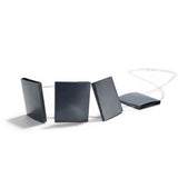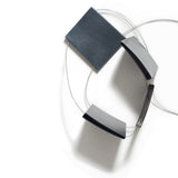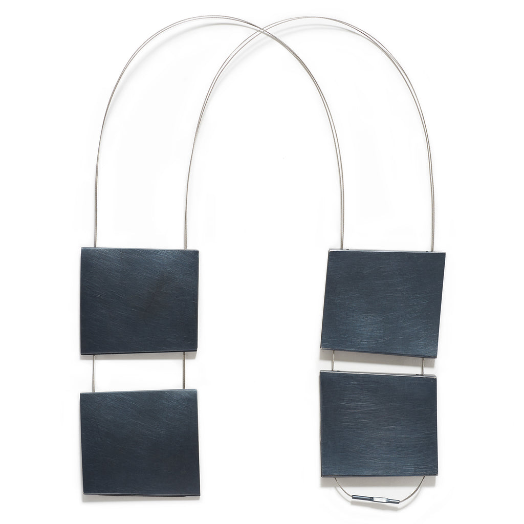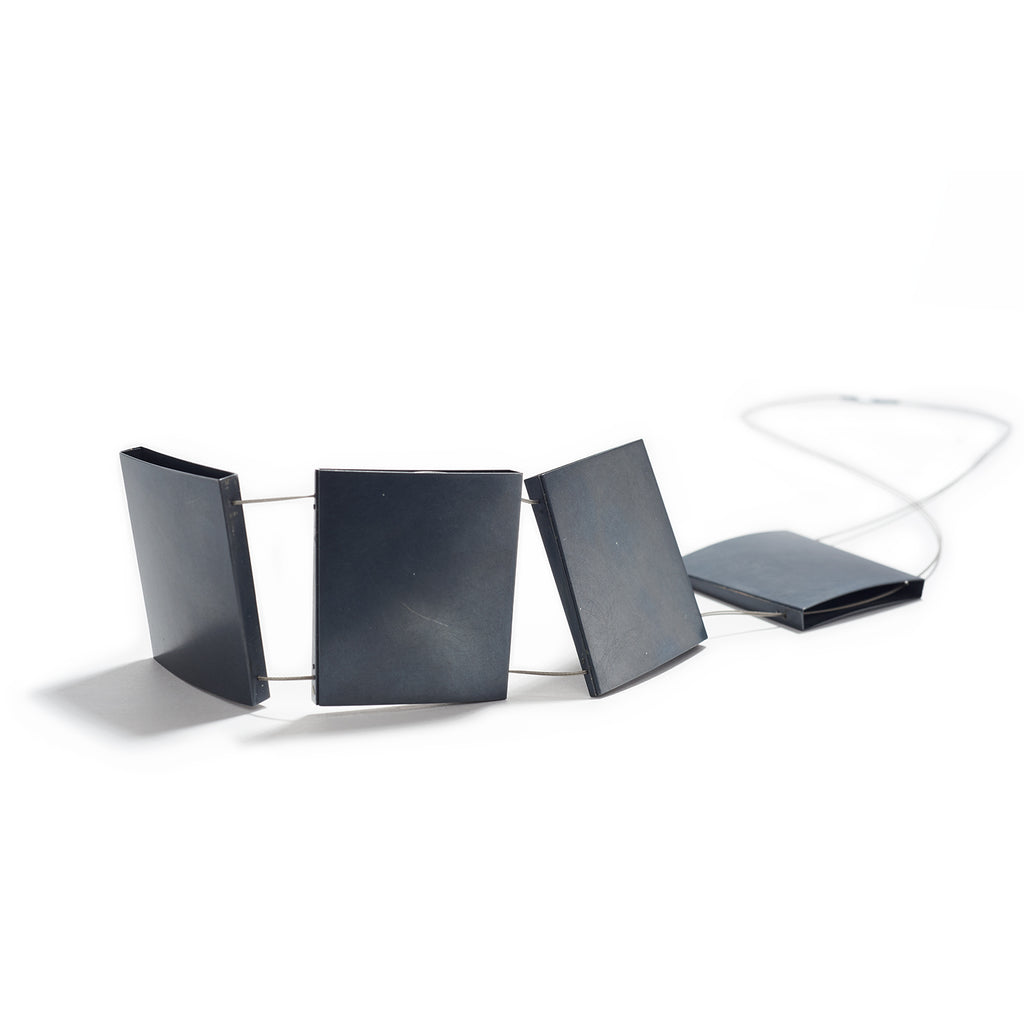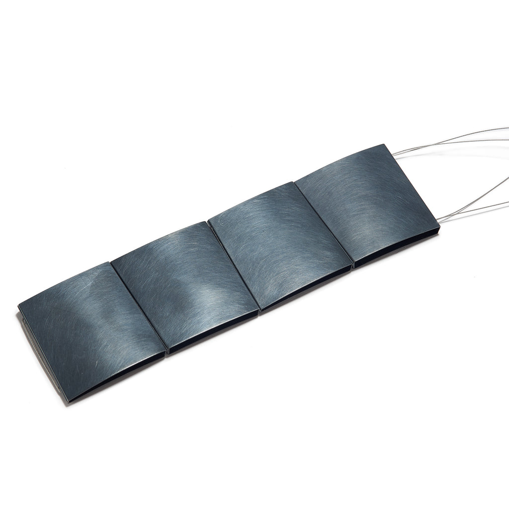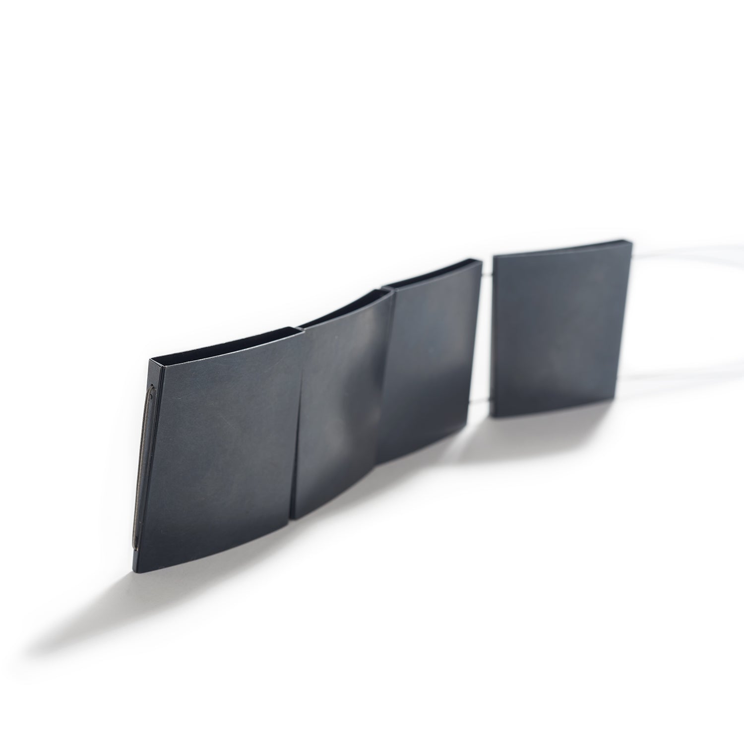 Resting upon lengthened silver cords, four hallow forms of oxidized sterling silver bear a dynamic amalgam of abstract illumination. Four apertures bore through each element, allowing the silver subjects to travel seamlessly along their threaded domain. Upon their undulating surfaces, observe the texture upon their silver planes, revealing the maker at work. A piece born of magnetic charisma is also one of versatility: One may adorn the rectangular pieces for a frontal statement or may wear a few to garner the back of the body. Artist, Valentine Dubois offers her heart into a piece of adornment which channels the adventurous and sophisticated yearnings of the soul.