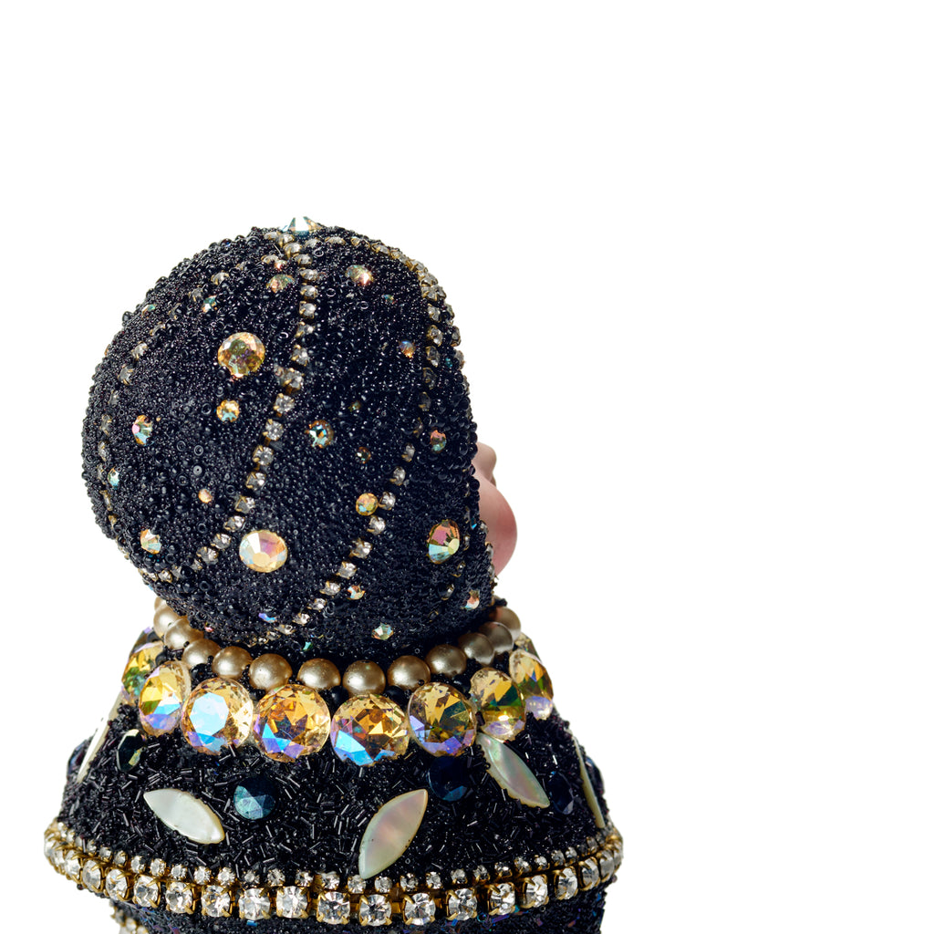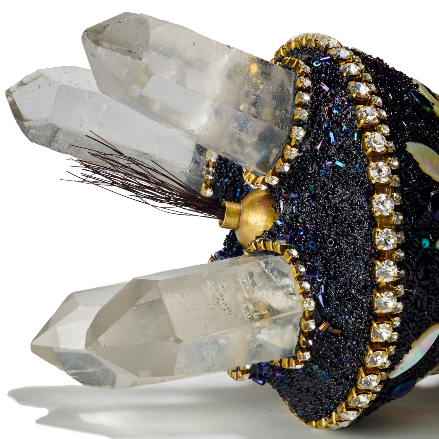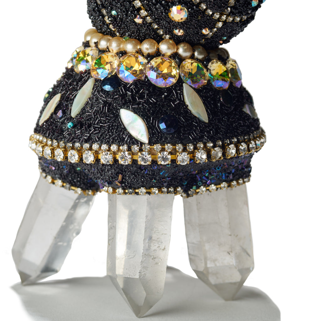 "Aladdin, a beaded space probe, is part of an interstellar training group of mineral-biological hybrids. A mystic and seer, Aladdin works for the Intergalactic Federation, using his insight to help lost or troubled planets find direction and hope. It’s meaningful work—and deeply rewarding. These space probes reflect my lifelong belief that we are not alone, and that energies beyond our understanding may be visiting us. As a child, I was fascinated by science fiction and UFOs—I never missed a good alien story at the movies. I still remember seeing a re-release of 2001: A Space Odyssey solo in grade school. About ten years ago, Scott and I saw a UFO. MUFON investigated. It remains unexplained to this day." Betsy Youngquist