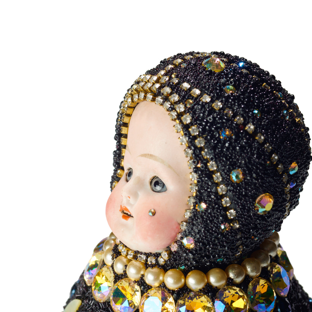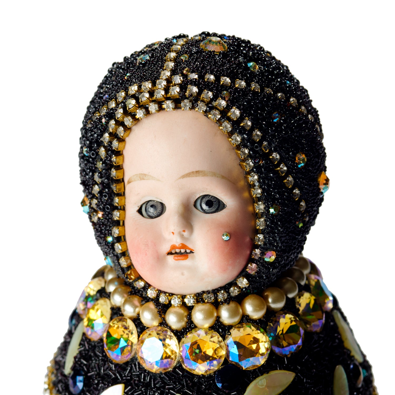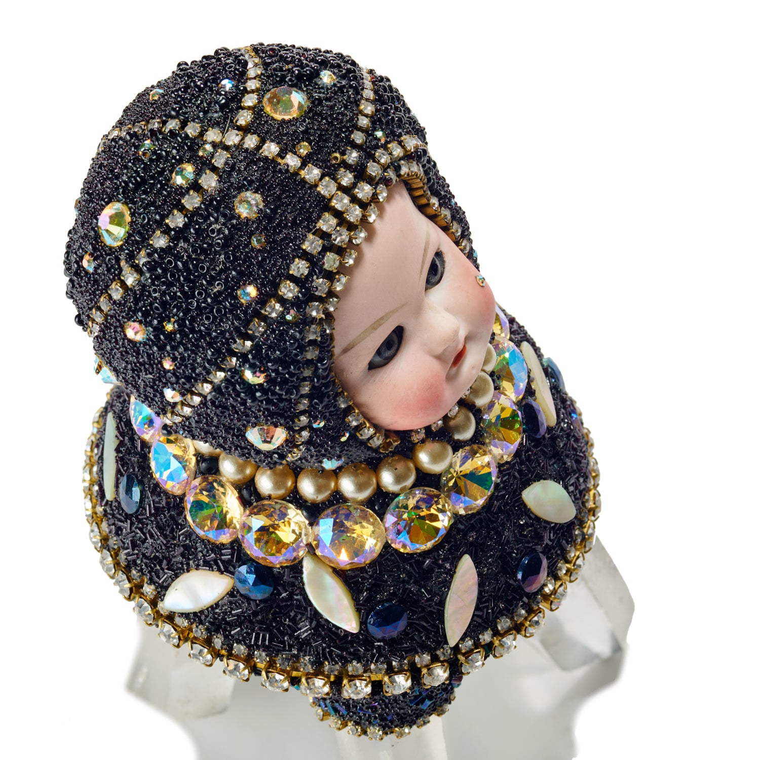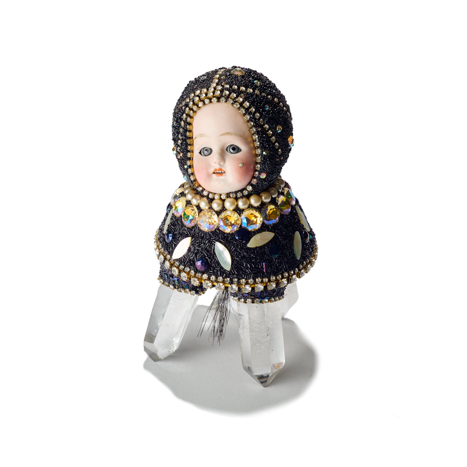 Antique porcelain doll head, Brazilian quartz crystal points, contemporary and vintage glass beads and stones, mother-of-pearl, cup chain from the Czech Republic, antique brass ring
