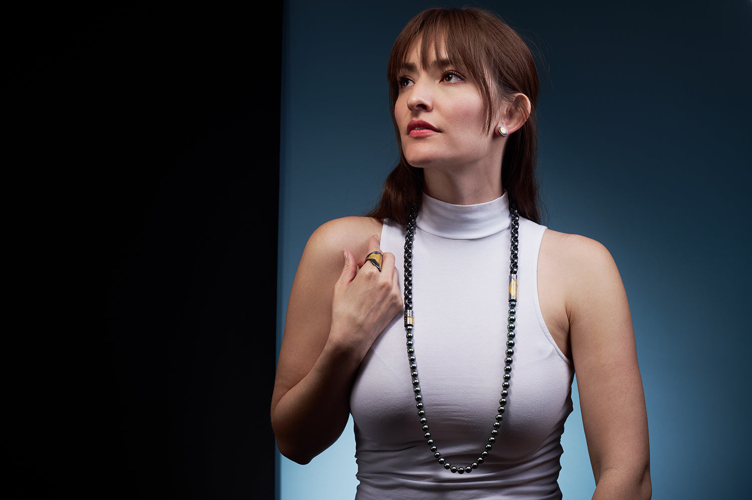 As shown with: Sterling Pea Chain, Bauhaus Short Clasp, Bauhaus Long Clasp, Tahitian Pearl Necklace, and Bauhaus Elongated Ring