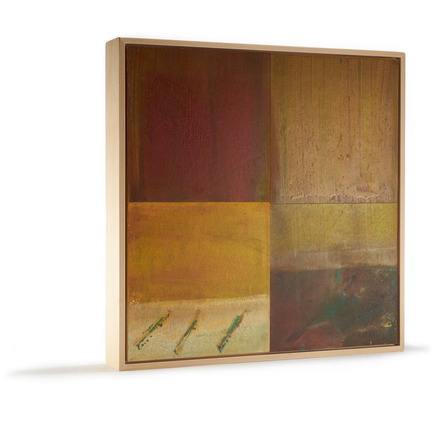 Diverse terrains are delightfully parceled between four planes of artful imagination. A deep sea of red and green seamlessly splashes into rolling sandy tides, swallowing faded speckles of color in its wake. Below, a fog of yellow sweeps into the brushes of pale alabaster, scored by eager streaks of green. Lastly, a cloud cover of soft, blended tones, grounded with forest green and rust red are touched by a light sky of mustard and golden brown. A stunning quartet of color, lovely in space, awaiting its forever home.