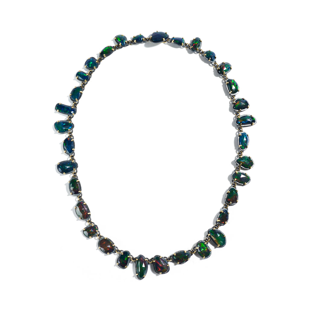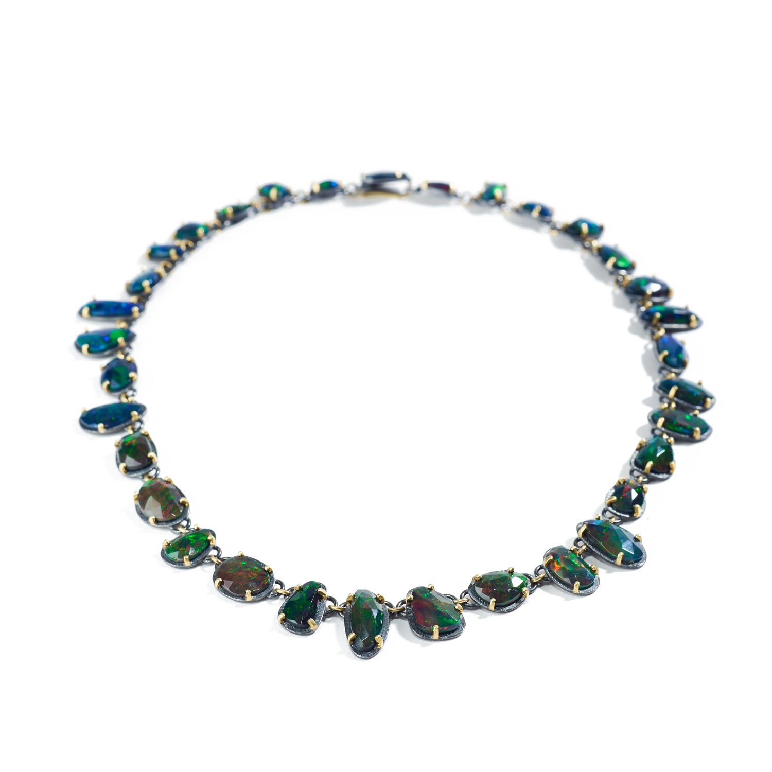 An array of rose cut black Ethiopian opals of varying shapes and sizes, each with unique flashes of color, are set with 18k gold prongs against deeply oxidized sterling silver backings. Each setting has been hand-fabricated to fit each individual opal and features our signature carved texture. Linked together with 18k gold loops and fastened with an invisible 18k gold hook, this stunning statement necklace drapes gracefully around the neck and can be worn in any orientation.