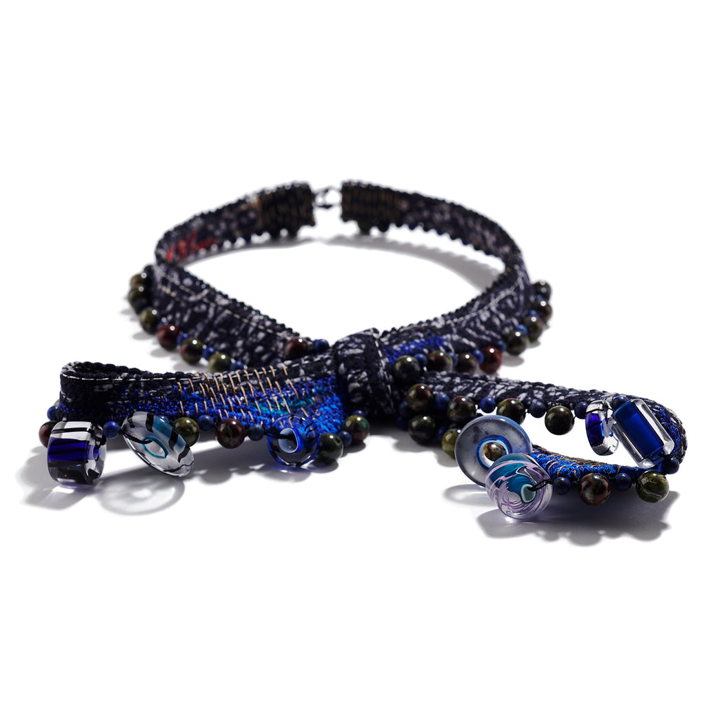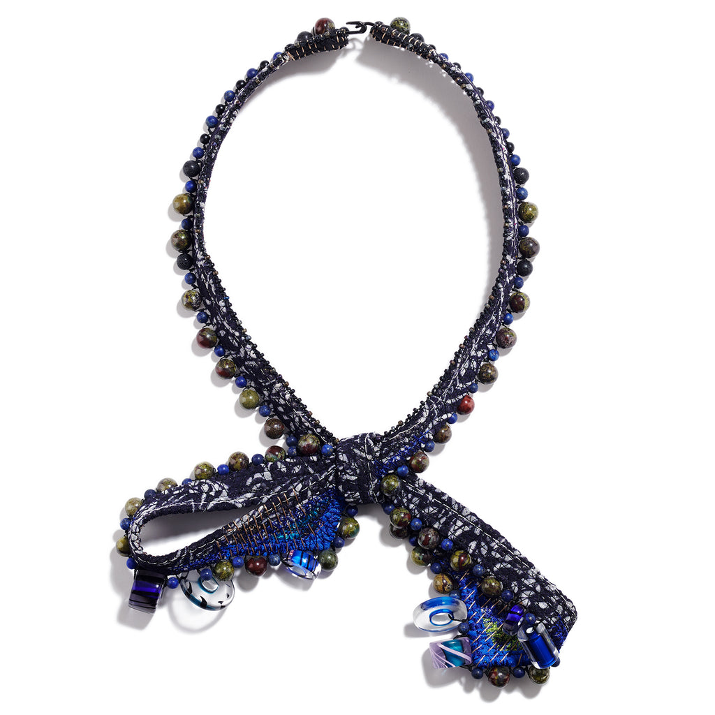 "Blue Bow," stitched, quilted, embroidered, constructed; fabric; Lampworked glass, cuperite, and lapis lazuli beads attached by needle lace stitch; metal hook closure.