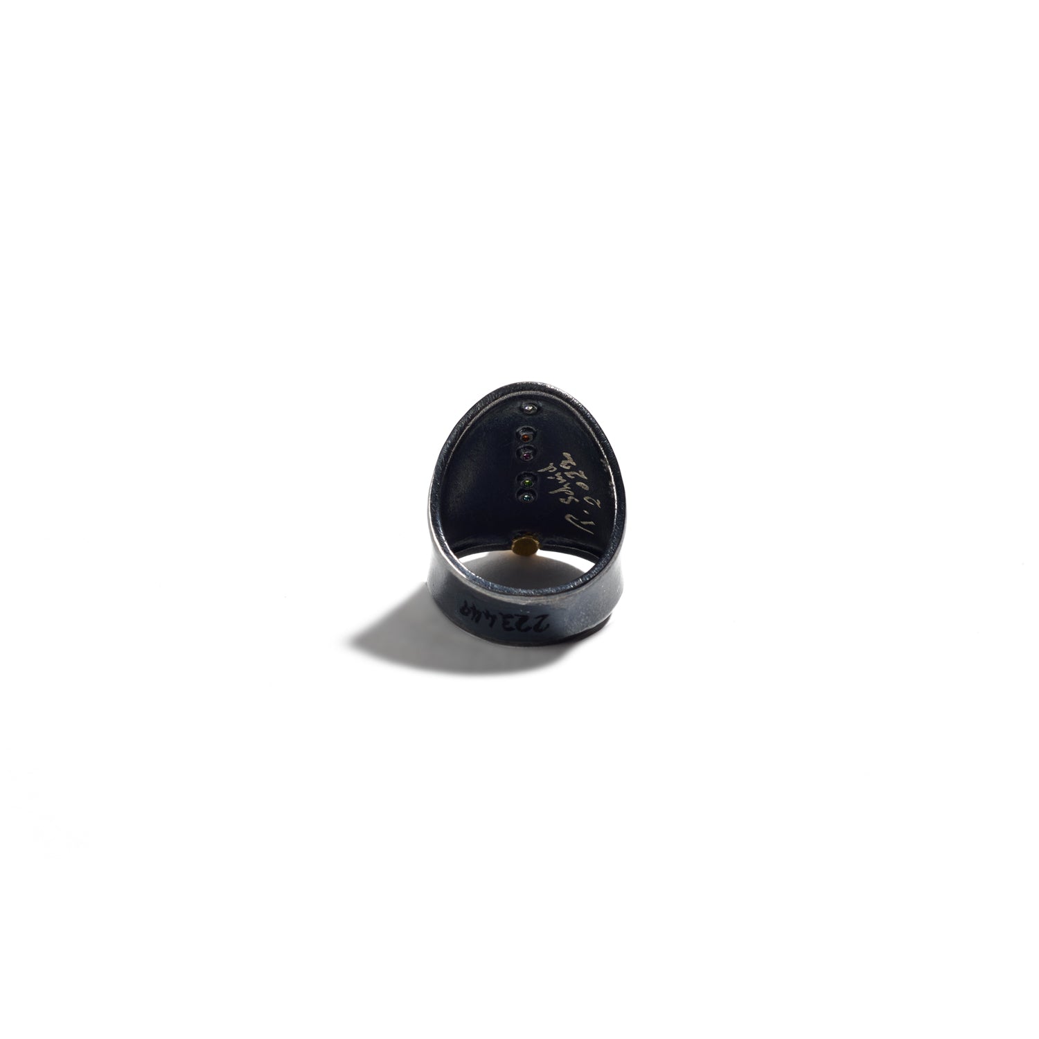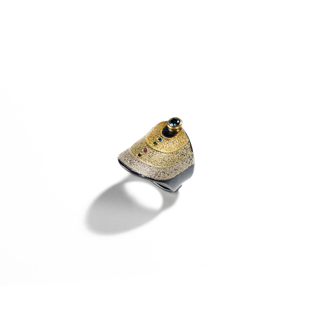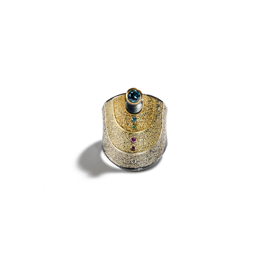 24K & 22K & 19K & 12K yellow gold, oxidized sterling silver, brilliant cut blue diamond 0.37 total carat weight, faceted blue, pink, and white diamonds, 0.04 total carat weight