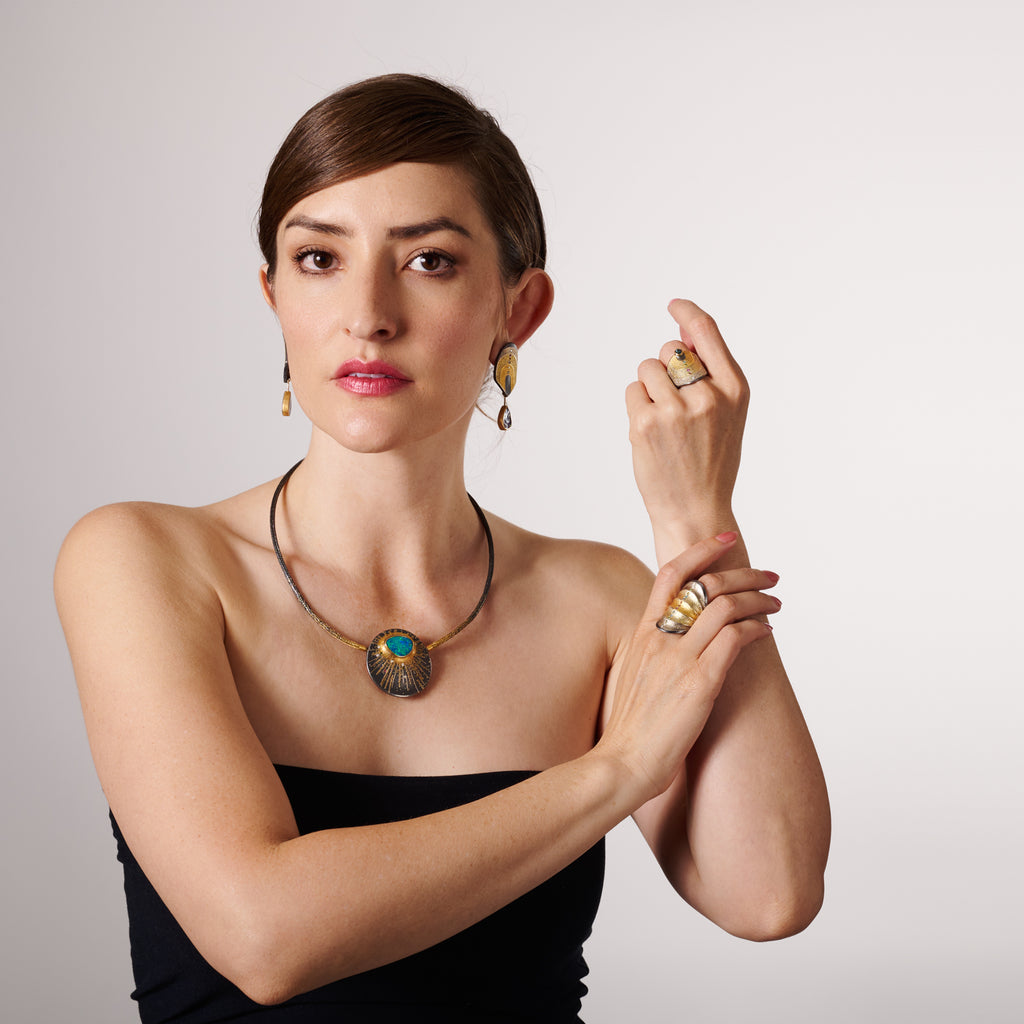 As shown with: Boulder Opal Earrings, Aurora Borealis Pendant/Clasp, Knitted Oxidized Silver And Gold Necklace, and Rainbow Diamond Ring.