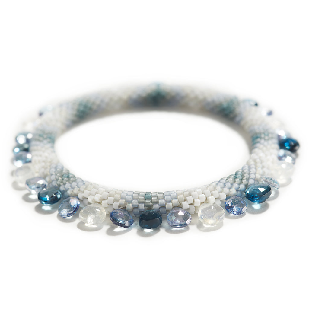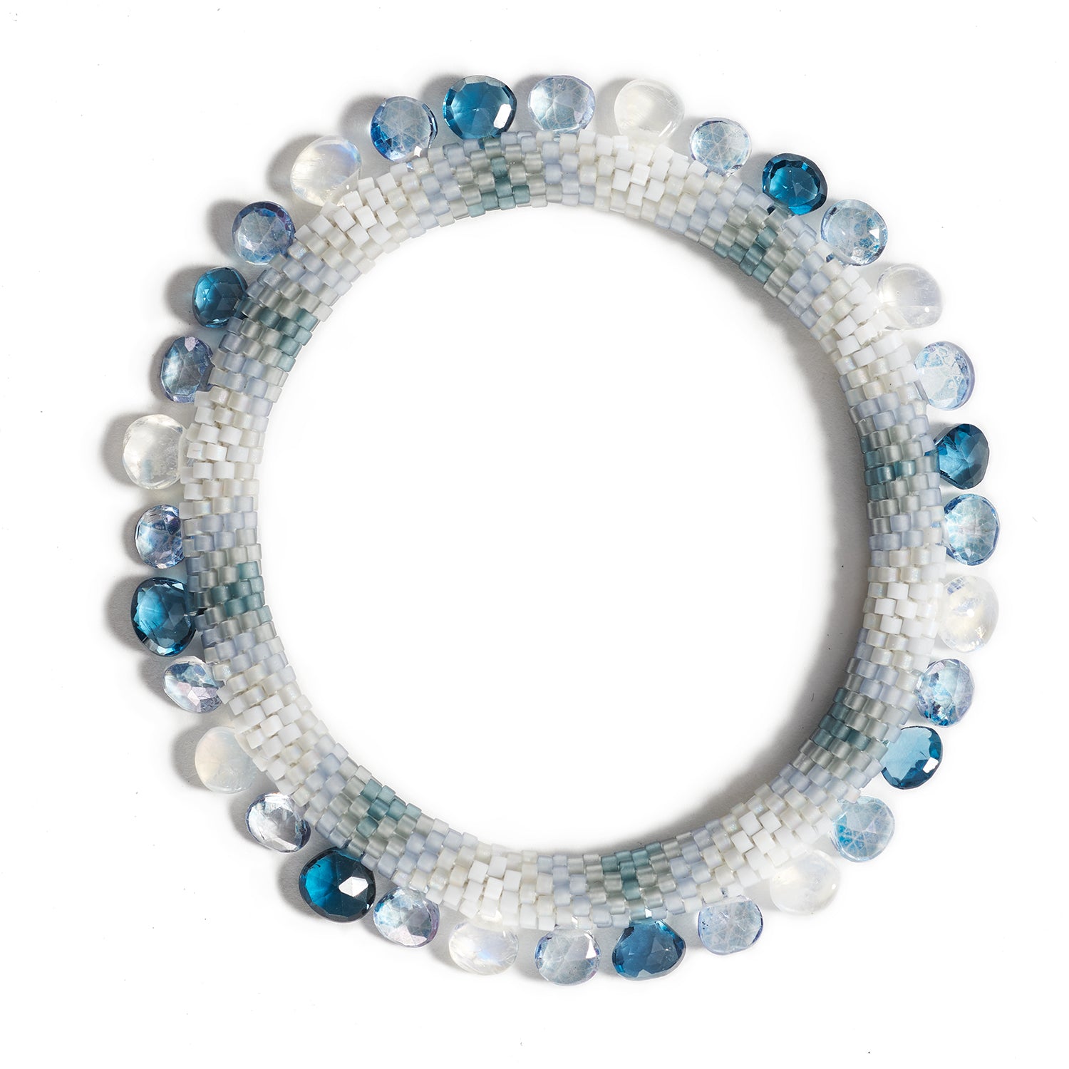 In the glistening gossamer of early morn, at about the time the grazing meadow receives its dew, there is a bold moon, seen just in view. Its bold edifice transforms the scene before it, into a tranquil atmosphere that is cool and bright. Taking in the moment, Claire Kahn manifests the setting into an intoxicating work of adornment. In an appeasing pattern, the artist unites pulses of cerulean blue with progressions of white that transcend into a hushed gray. Following the beaded strand, the mind relaxes upon the sight of soothing elation. Around the piece's perimeter, Claire fashions an assemblage of moonstone and topaz, evoking the luscious glint and gleam of the morning scene, right before sunlight encompasses the landscape. Here, the artist creates a compelling work of art, one of stunning, yet quiet magnificence.