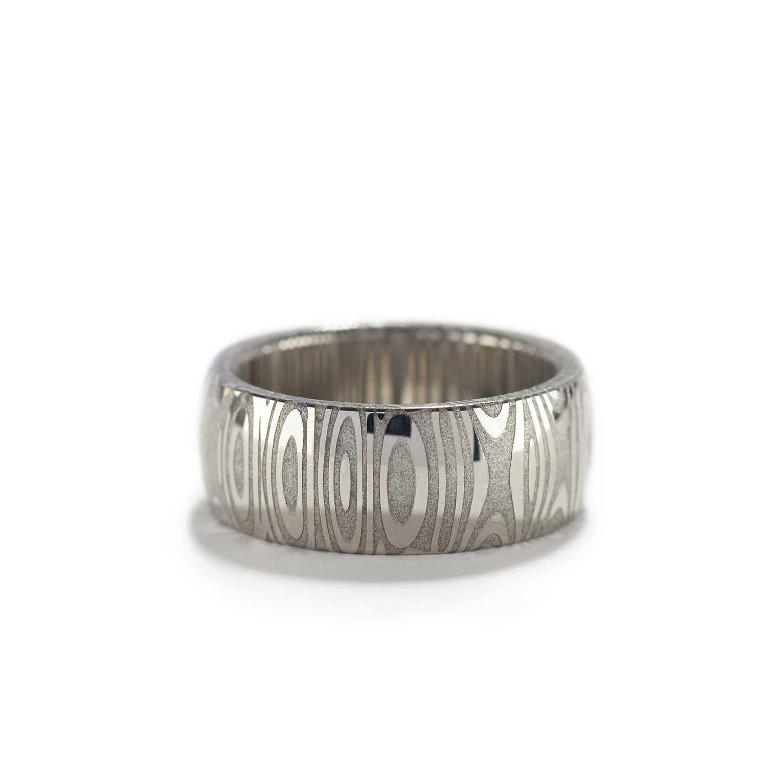The classic low dome band by Phil Poirier is much to admire and a comfortable fit on the hand. The Analemma pattern which adorns this ring is reminiscent of the "infinity" symbol seen on world globes. It can be transversed into the "equation of time" representing the Sun's annual path through the sky. If you explore the design in greater detail, you may see the infinity pattern running through the steel. Orbital shapes dance along their circular space, creating a lovely display amongst the band's variegated polished and matte surface. Through its sheen illustration of form and design, this piece is the energized versatility you've been looking for.