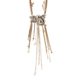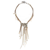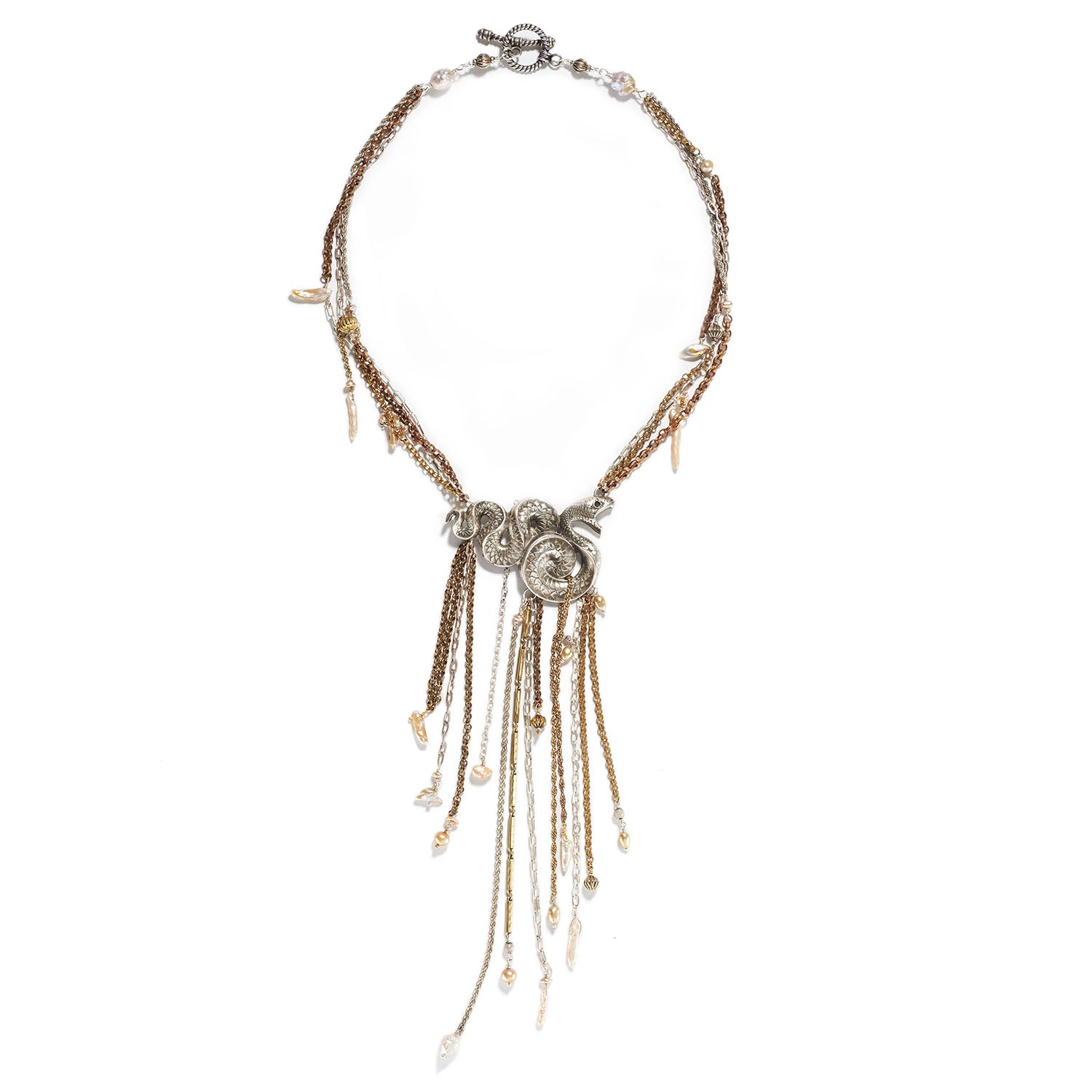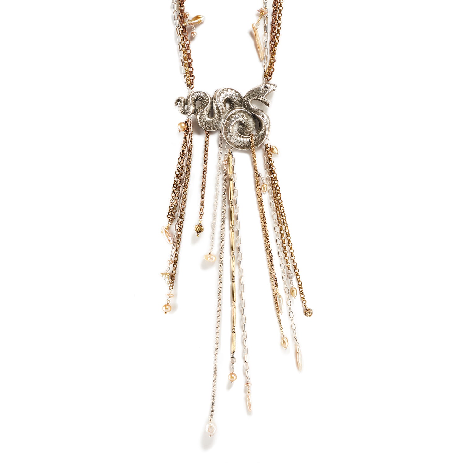 In this piece, Lucia Antonelli creates a statement of sultry charm. Intoxicating the senses, Antonelli emboldens this work with a serpentine pendant. Gaily, it holds the medley of sterling silver and antique brass chains together in a stately and weighted piece to lure the soul. Adding luminous balance to her work, the artist imbues the piece with the delicate touches of gleaming pearls. Their unique contours in shape and form enliven a work of tempting and mysterious adoration. Quite an intriguing work, beckoning further curiosity in its wake.