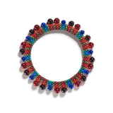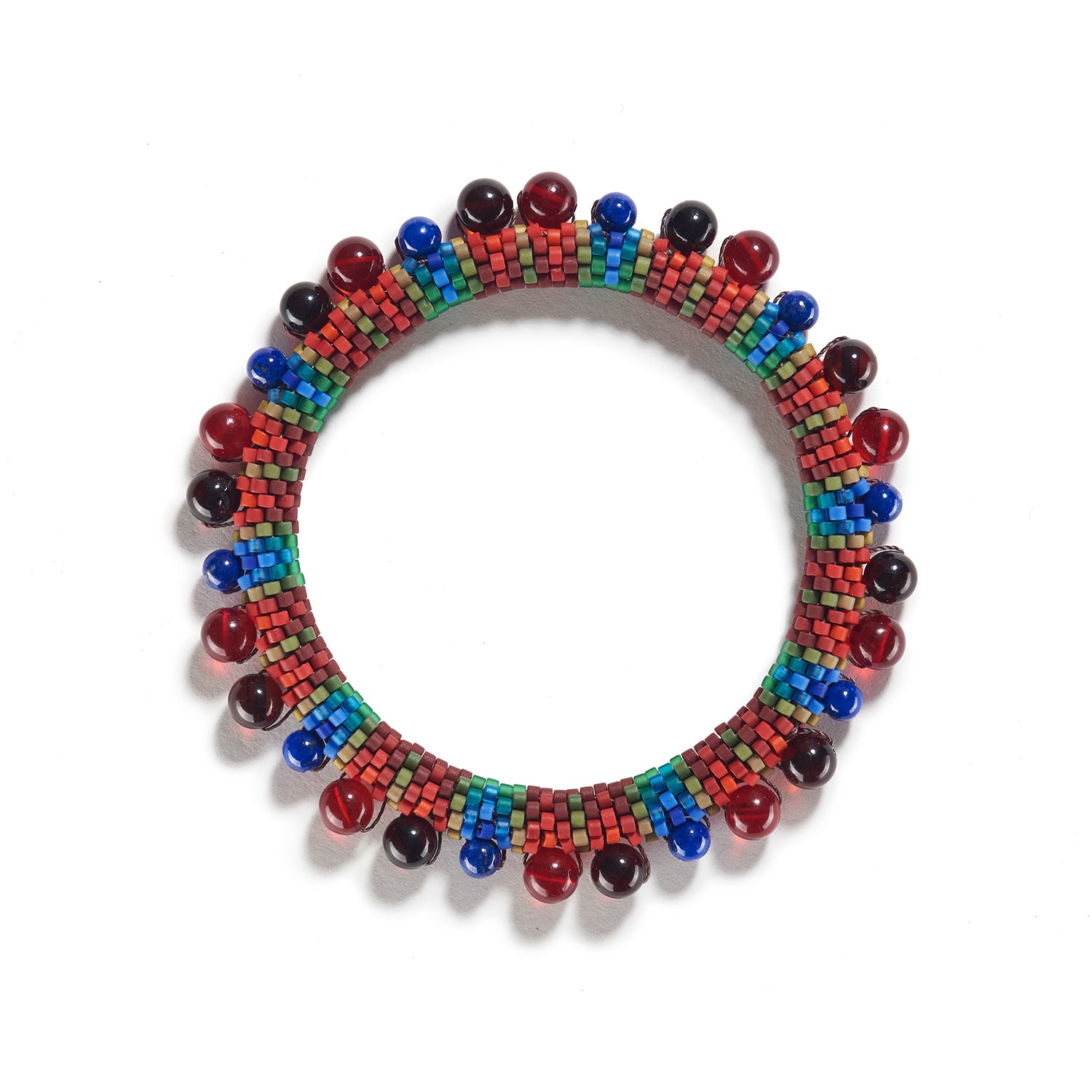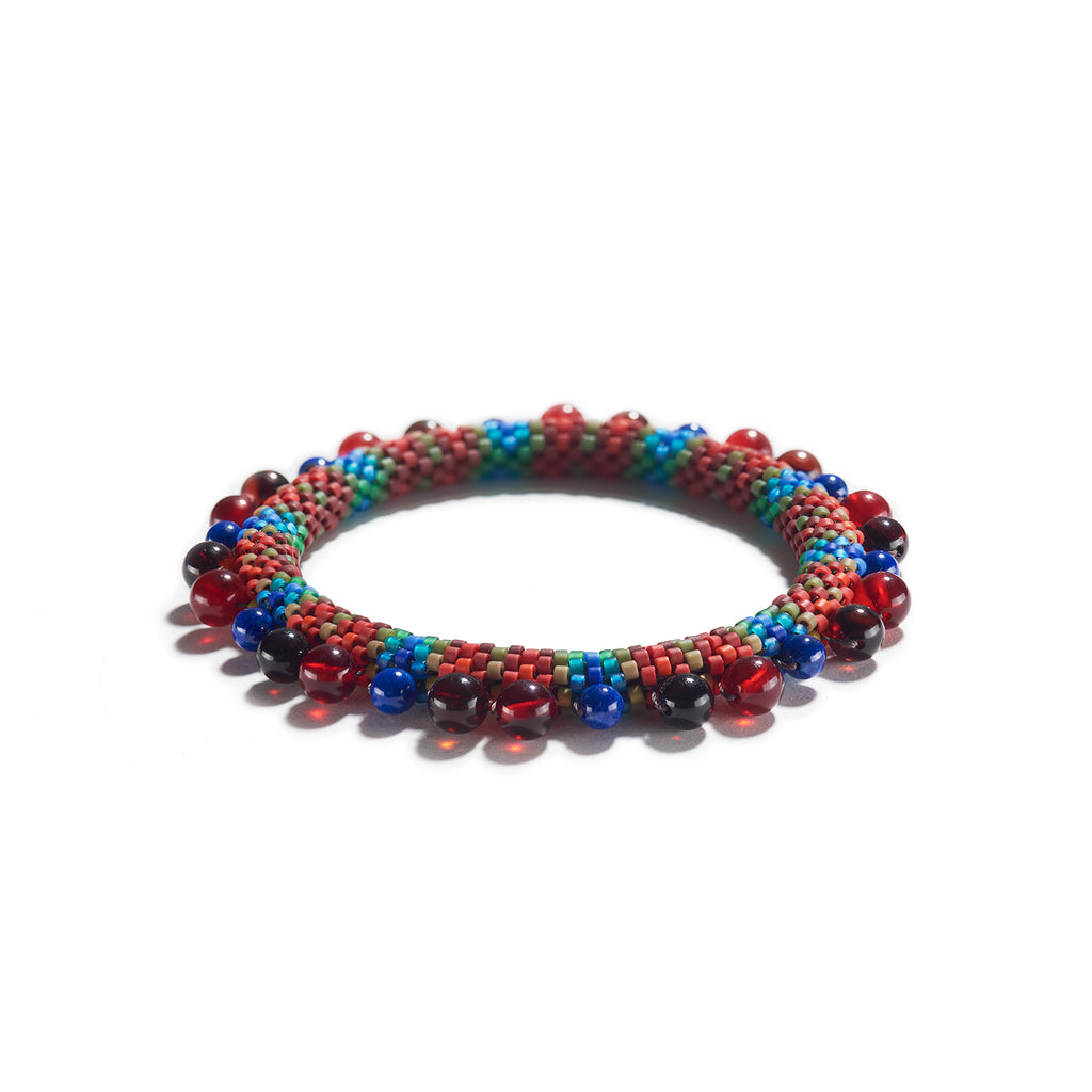A lush, colorful configuration sweeps the senses as Claire Kahn introduces a new design of adornment, proudly imbued with the luscious notes of cherry amber. Across her beaded pattern, rich hues in red are softly juxtaposed to cooler shades of green and blue. Gently, hushed gold tones embrace the rounded amber and deep blue lapis lazuli to create a finished composition of sweet intoxication. The sumptuous, glistening globes of amber and lapis lazuli run the perimeter of the piece in brilliant gleams of full red and blue. With a light tug around the hand and on the wrist, the work is a comfort to admire. Delight at the splendor of the saturated stones. Claire Kahn creates a work to ever marvel and charm the soul.