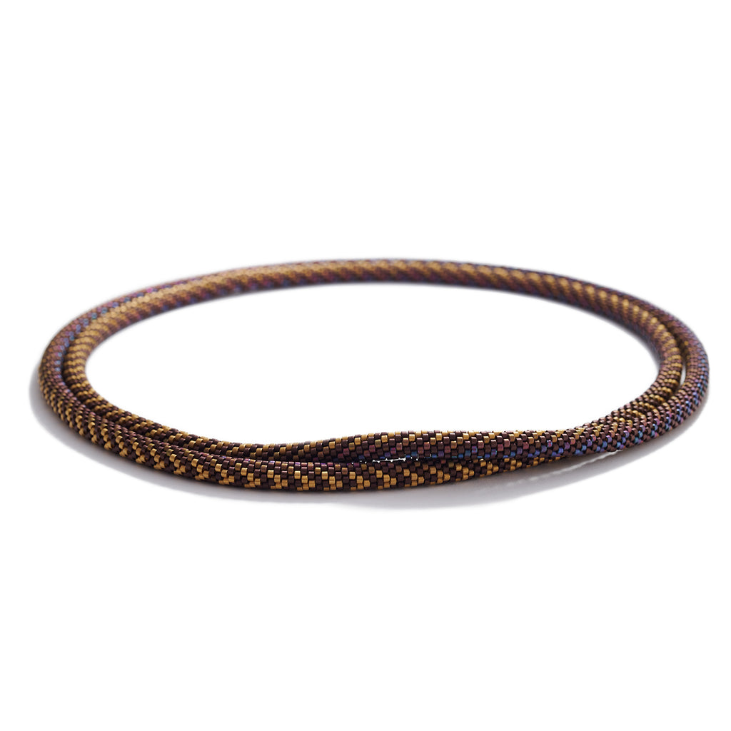 Claire Kahn creates a necklace in Chevron pattern that ranges from gold to metallic red, purple, brown, and blue, creating a piece both bright and rich to adorn in any engagement.