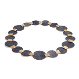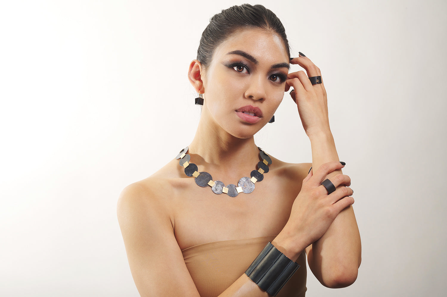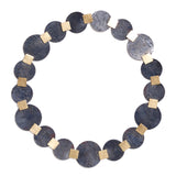 As shown with: Black Rainband Crackle Ring, Black Rainband Crackle Ring with Cognac, Scalloped Bracelet in Silver, and Black Trapeze Earrings with Gold.