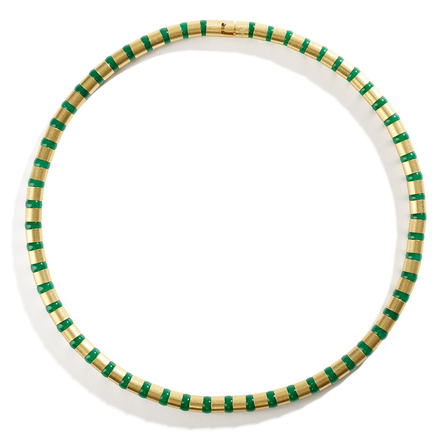 With the look of ancient jewelry that might have adorned the woman they’re named for, Erich’s Cleopatra necklaces evoke another time. Like his pods, they’re sleek and architectural, but in a completely different way. Combining precious metals with gemstone material, these necklaces call to mind the symmetrical, clean lines of Egypt. Glamour from another age, created for this one.