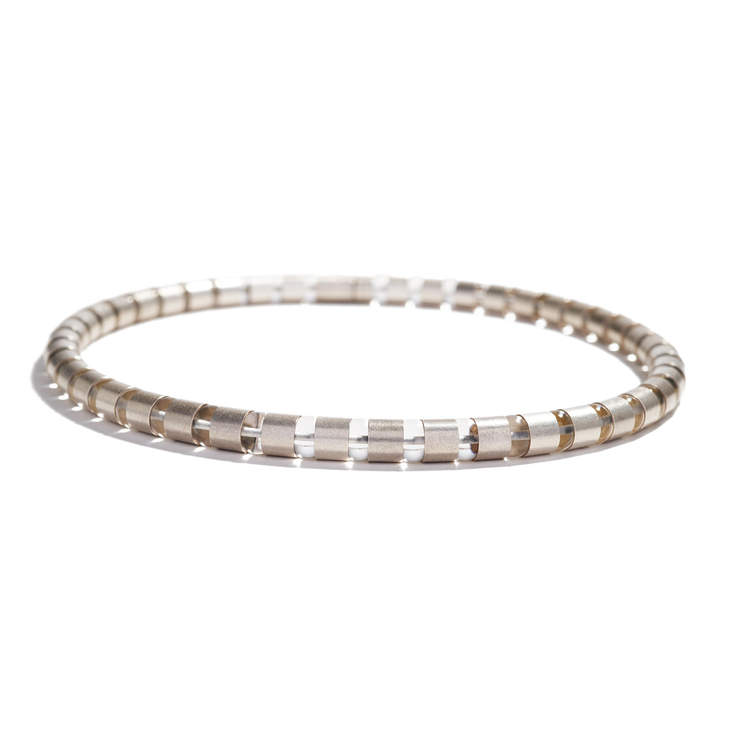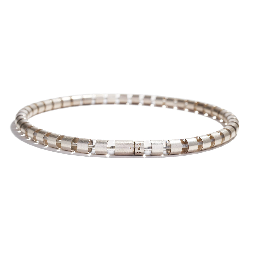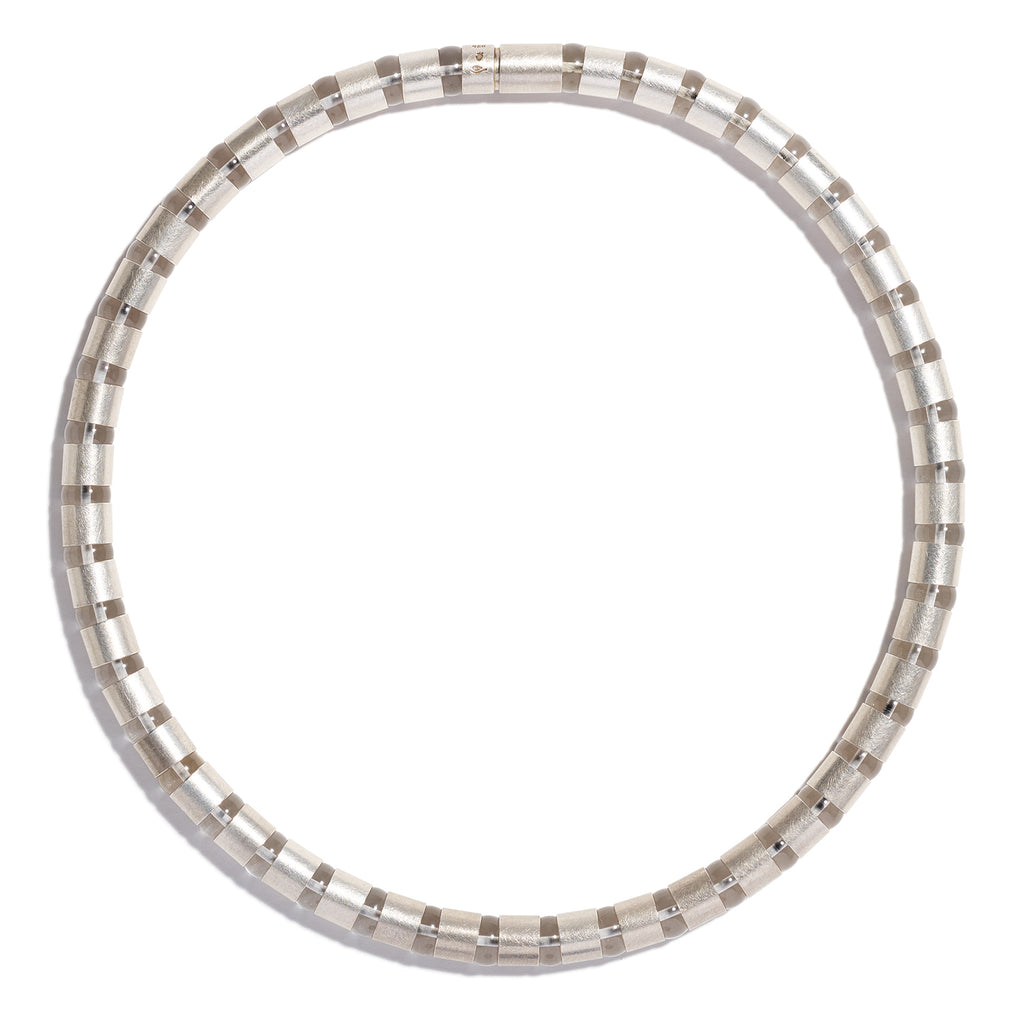 With the look of ancient jewelry that might have adorned the woman they’re named for, Erich’s Cleopatra necklaces evoke another time. Like his pods, they’re sleek and architectural, but in a completely different way. Combining precious metals with gemstone material, these necklaces call to mind the symmetrical, clean lines of Egypt. Glamour from another age, created for this one.