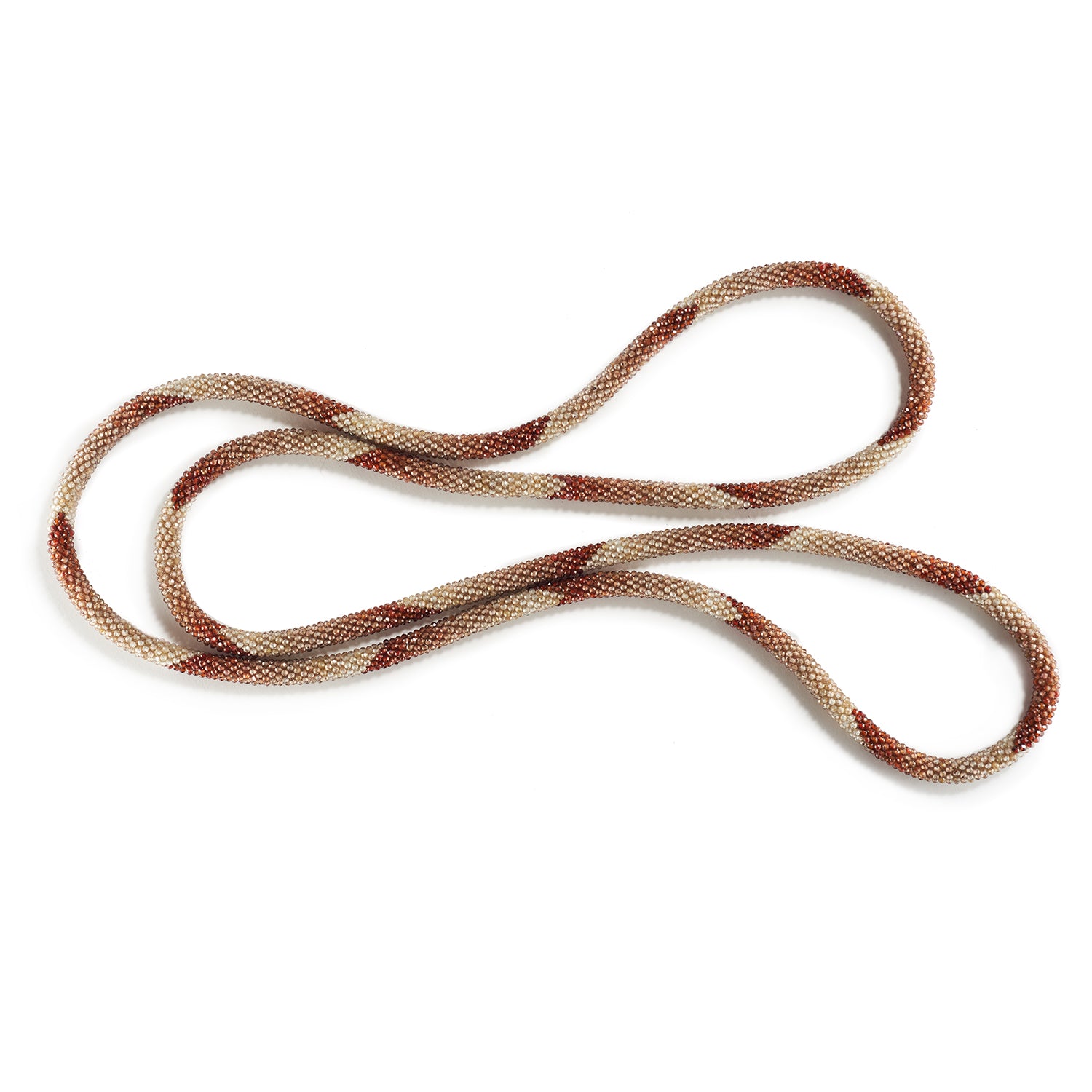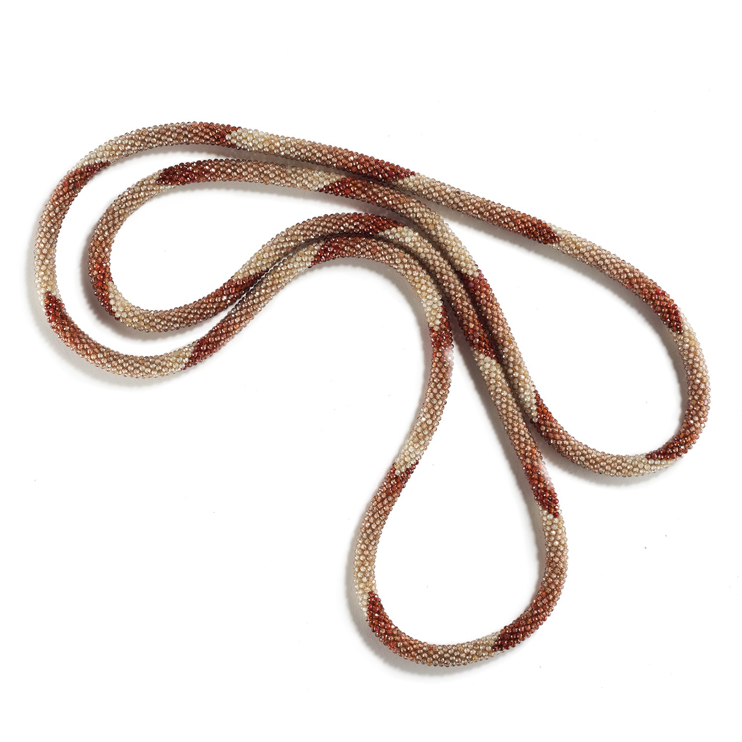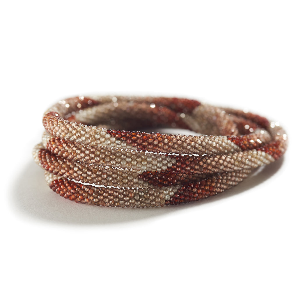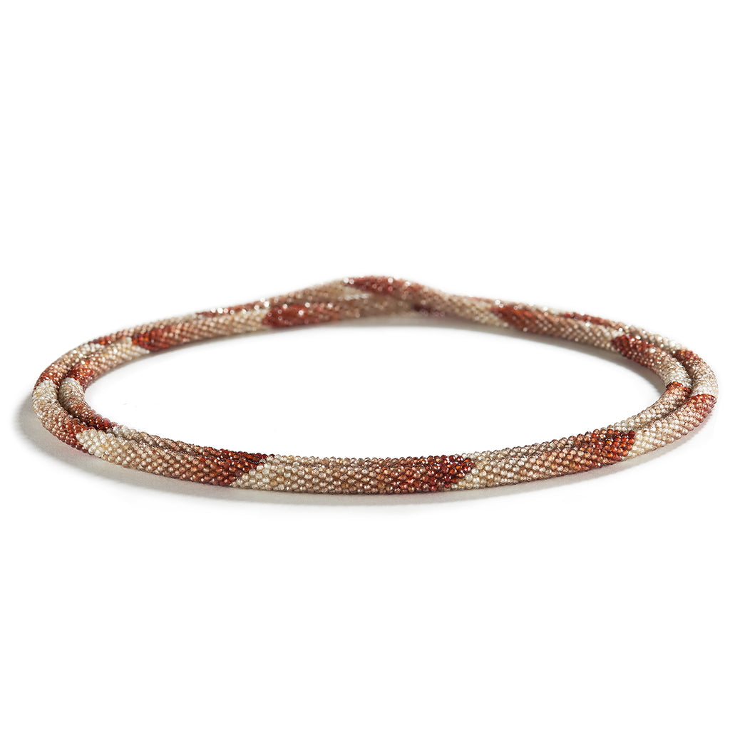 Magnificent, shimmering effervescence pervades this irresistible work of December by Claire Kahn. The maker outdoes herself as we marvel at her brilliant imagination. Skillfully, she strings an opulent progression of zircon to satiate our continuous infatuation. Beginning with a deep red, the stones slowly transition to the pleasing tones of beige to rest upon the ravishing quality of pale gray. Upon the light, observe as each stone ceaselessly sparkles in its wake. On the body, the work is an arresting beauty, enchanting one of the full-seasoned soul of holiday tidings. An absolute comfort to adorn as well as an ineluctable treasure to behold. Kahn endeavors to capture the heart in her mesmerizing discernment of color and pattern in sumptuous expressions through the year.