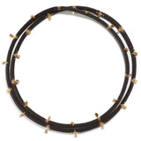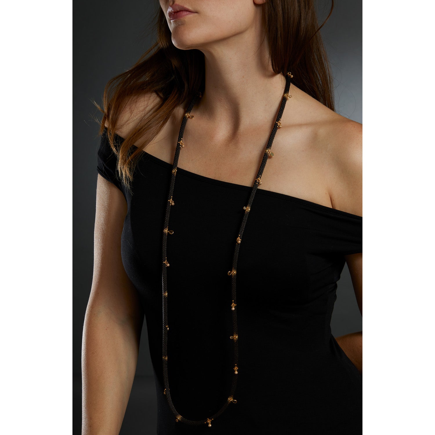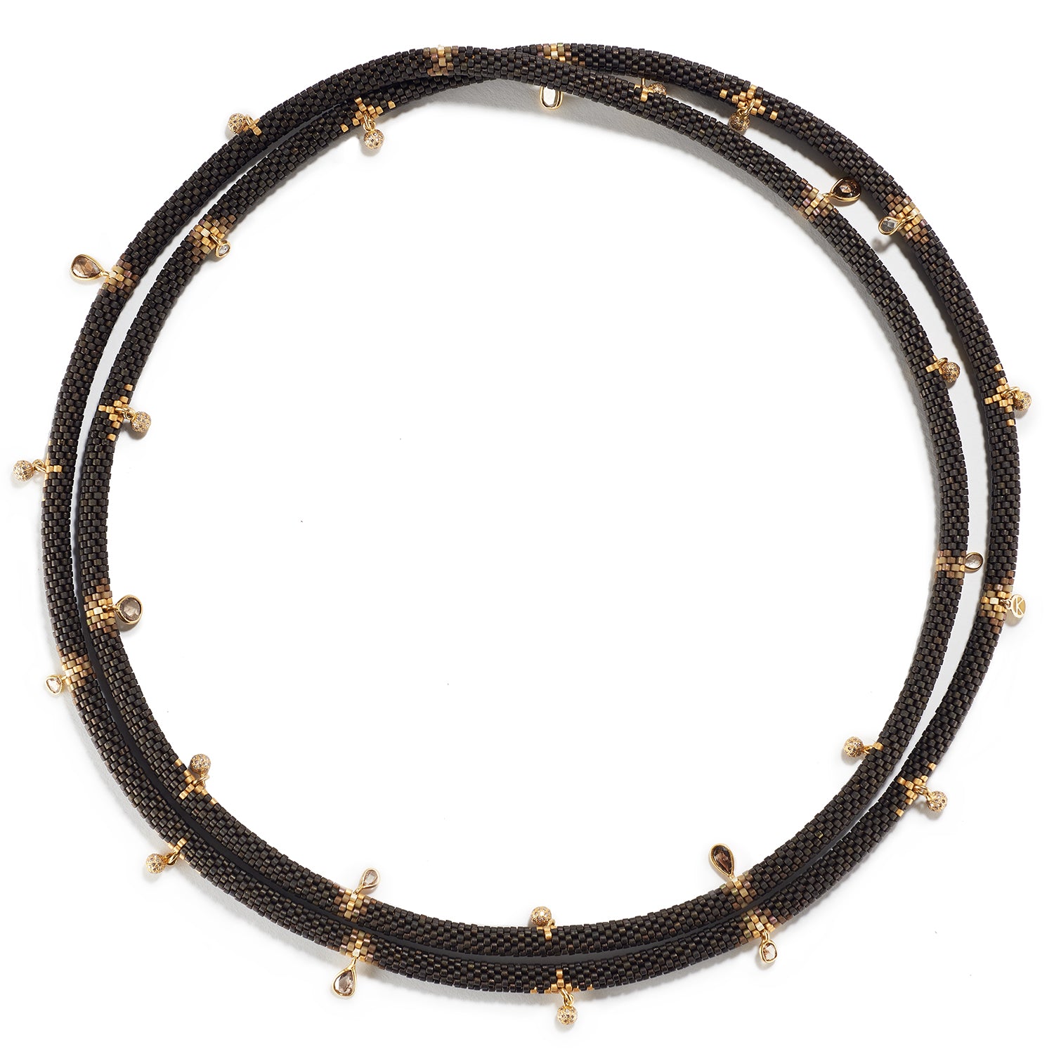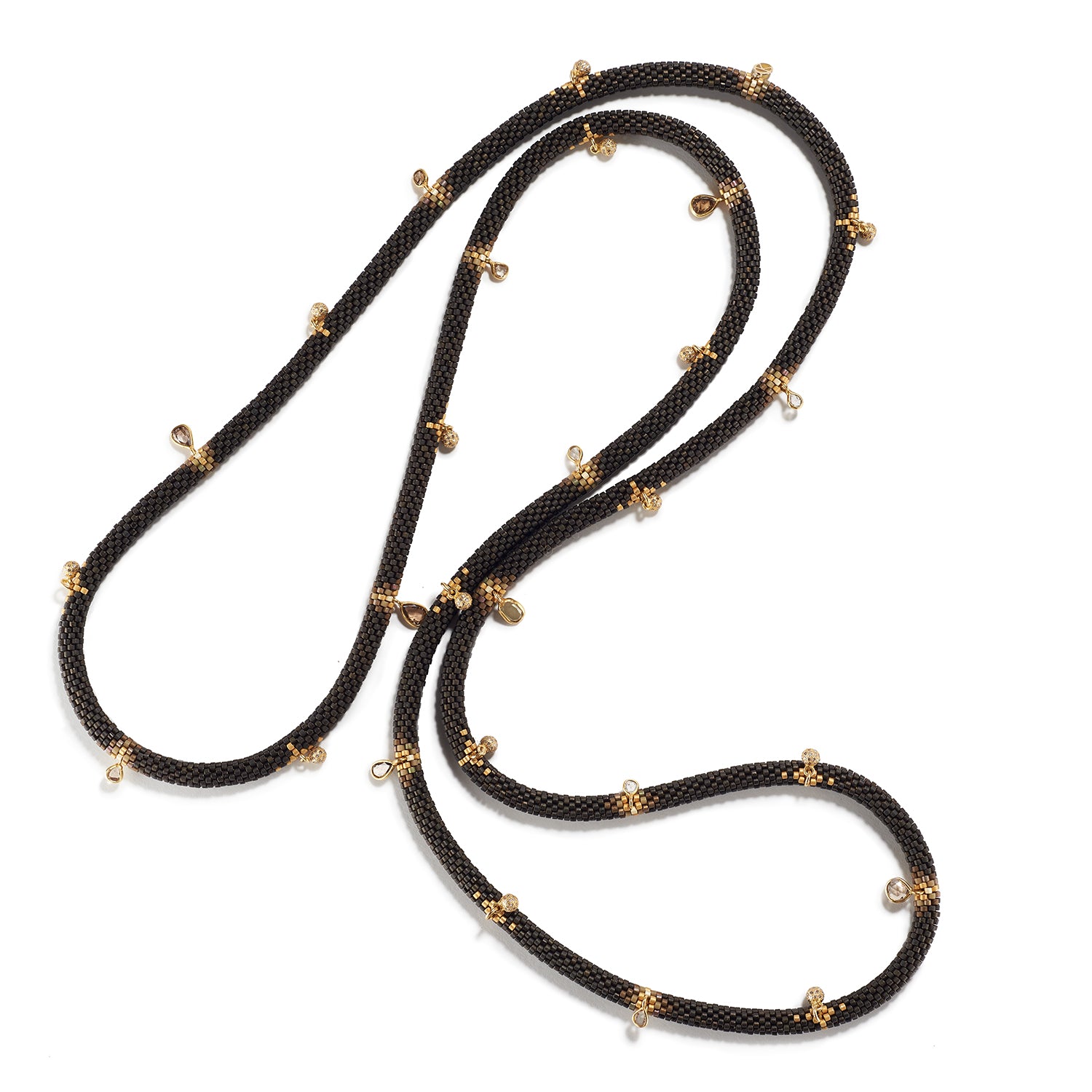 Cylindrical glass beads in 'Pools of Light' pattern, diamond charms including faceted white, yellow, gray and brown diamonds set in 18K yellow gold bezels, 18K yellow gold pavé diamond balls