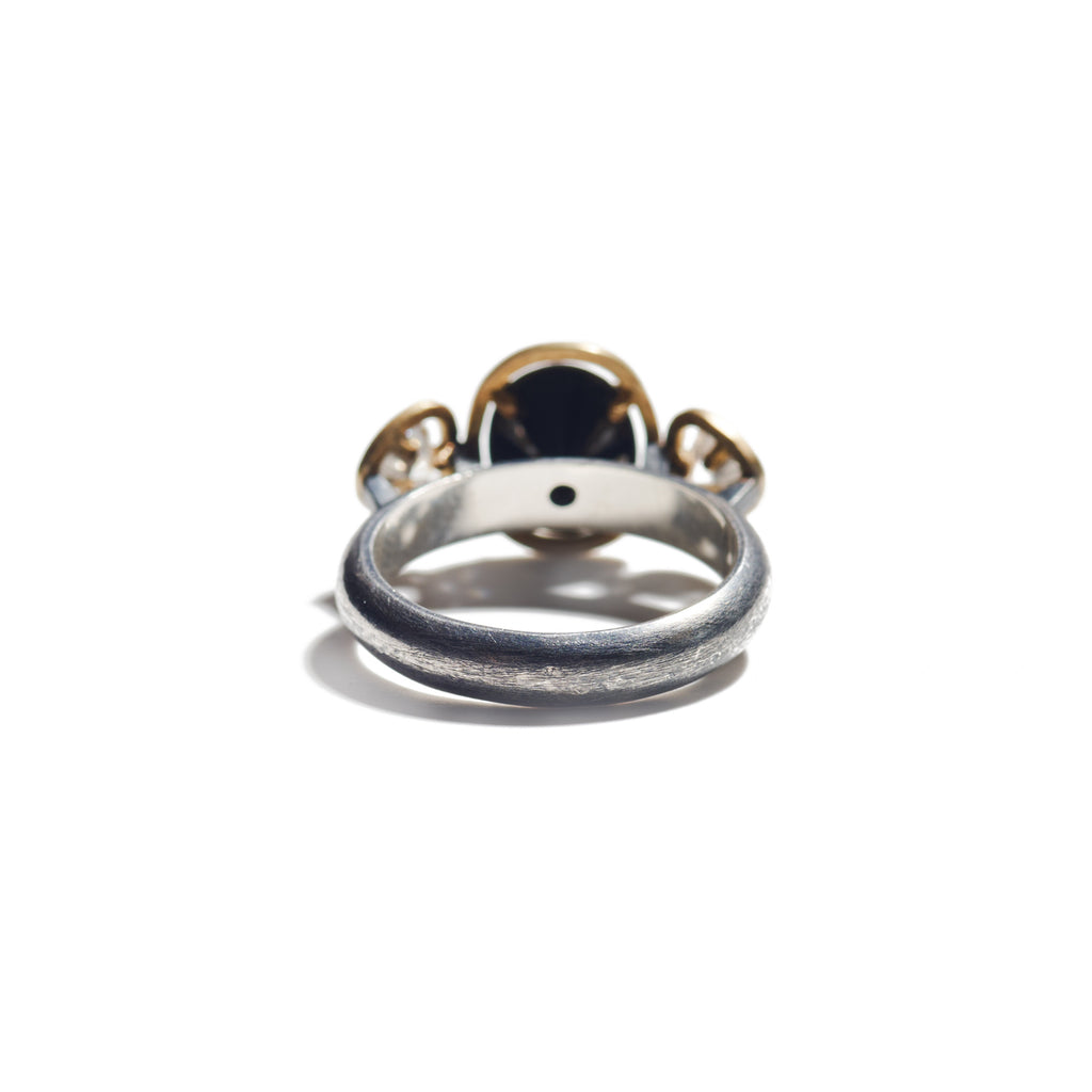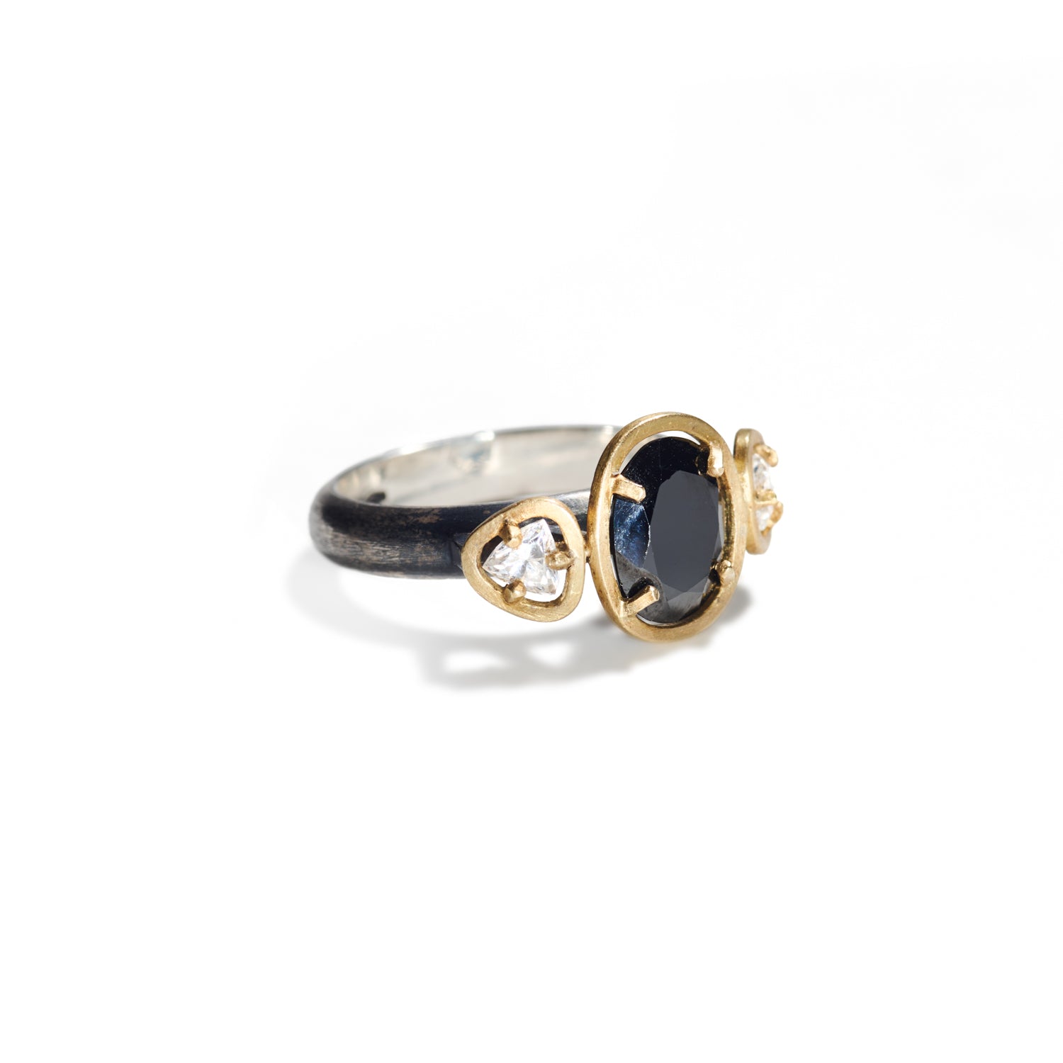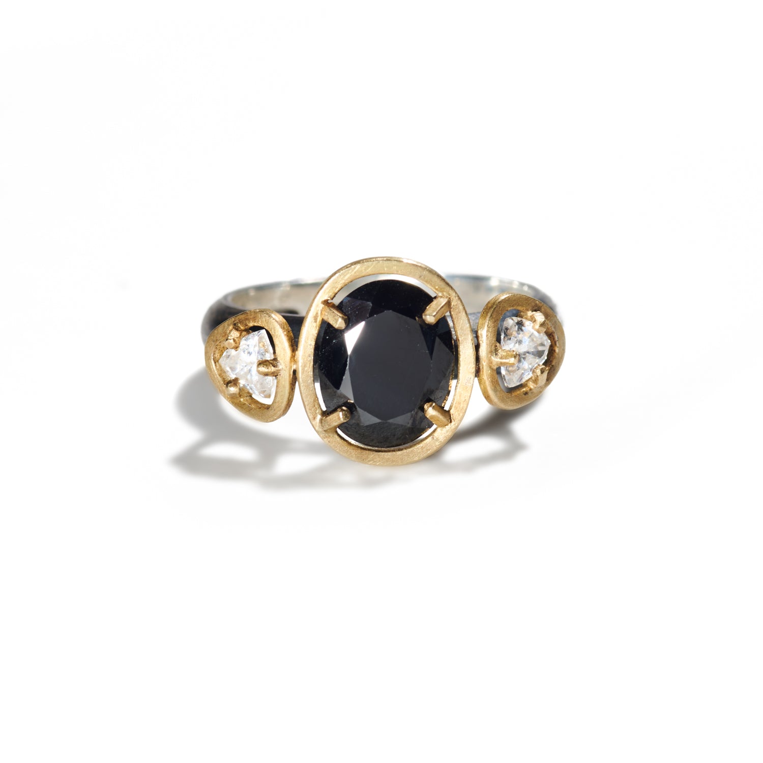 The ring features a bold, yet elegant design crafted from oxidized sterling silver, giving it a dark, antiqued finish that enhances its depth and character. The centerpiece is a striking faceted black diamond, catching the light with a moody brilliance. On each side of the opaque black gemstone are two faceted white diamonds, creating a striking contrast against the dark metal. Delicate high karat yellow gold frames the diamonds, adding warmth and richness to the design. The combination of oxidized silver, gold, and the interplay of black and white diamonds gives the ring a sophisticated, contemporary edge with a touch of vintage appeal.