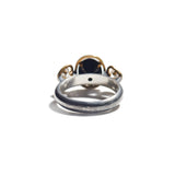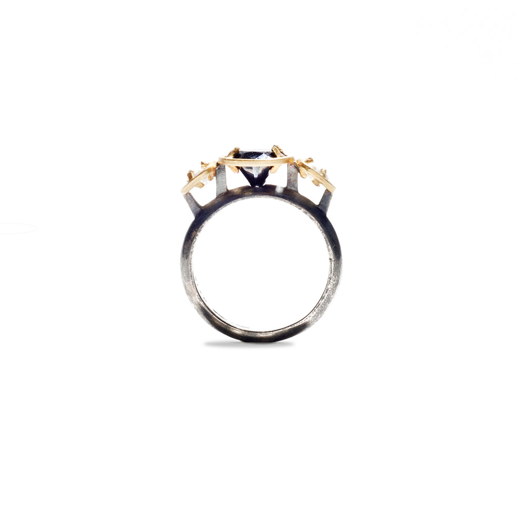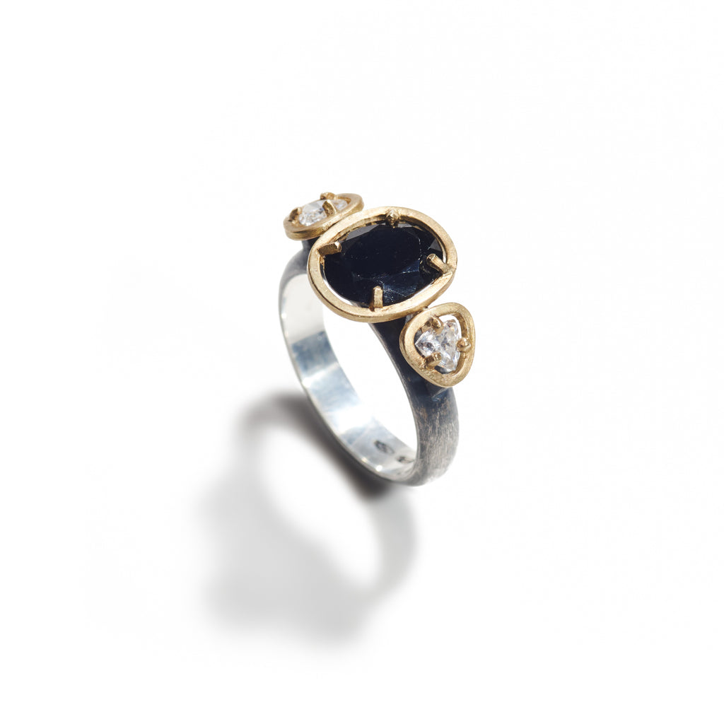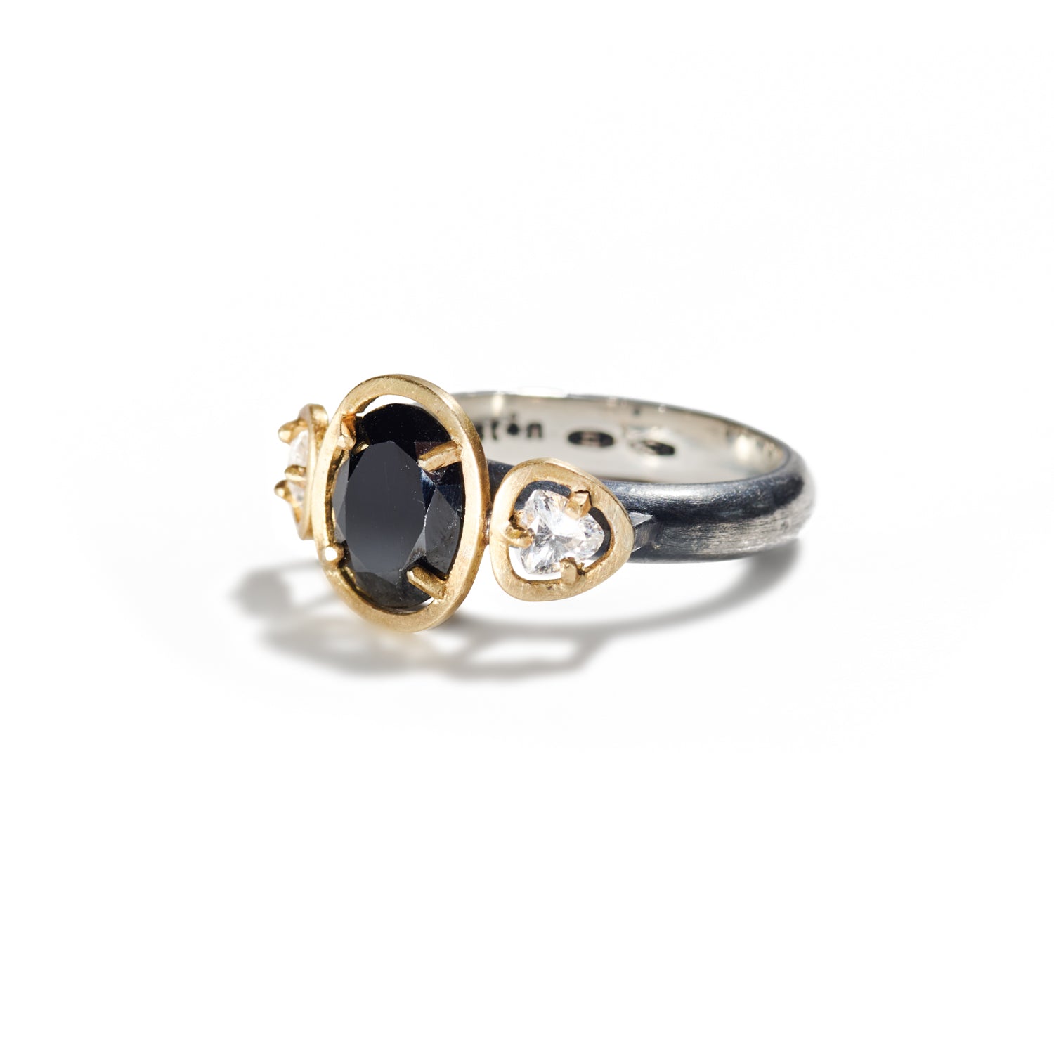 The ring features a bold, yet elegant design crafted from oxidized sterling silver, giving it a dark, antiqued finish that enhances its depth and character. The centerpiece is a striking faceted black diamond, catching the light with a moody brilliance. On each side of the opaque black gemstone are two faceted white diamonds, creating a striking contrast against the dark metal. Delicate high karat yellow gold frames the diamonds, adding warmth and richness to the design. The combination of oxidized silver, gold, and the interplay of black and white diamonds gives the ring a sophisticated, contemporary edge with a touch of vintage appeal.