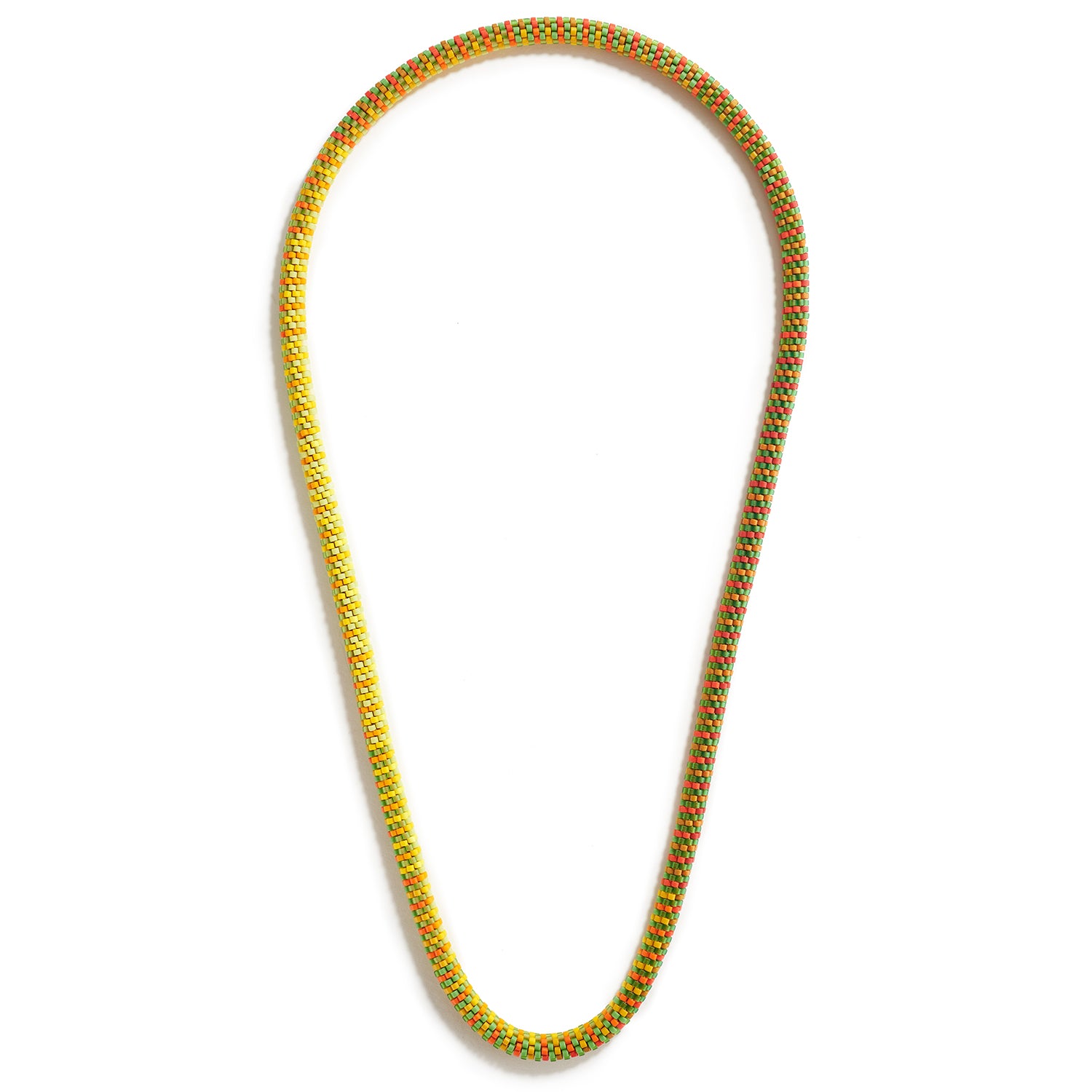 "For Your Pleasure is about cheerful color. Pieces are intended to be fun, playful and easy to wear. They are necklaces that can also be worn as bracelets when wrapped three times around the wrist. Some pieces use complimentary color combinations, including purple and yellow, green and red & blue and orange, that gives the necklaces animation and vibrancy. Others are softer and more mellow in color with little contrast. Patterns vary from chevron to spirals and Lyda pattern. All pieces in the series progress from light to dark, and may be paired or combined, to wear together." - Claire Kahn