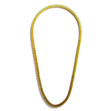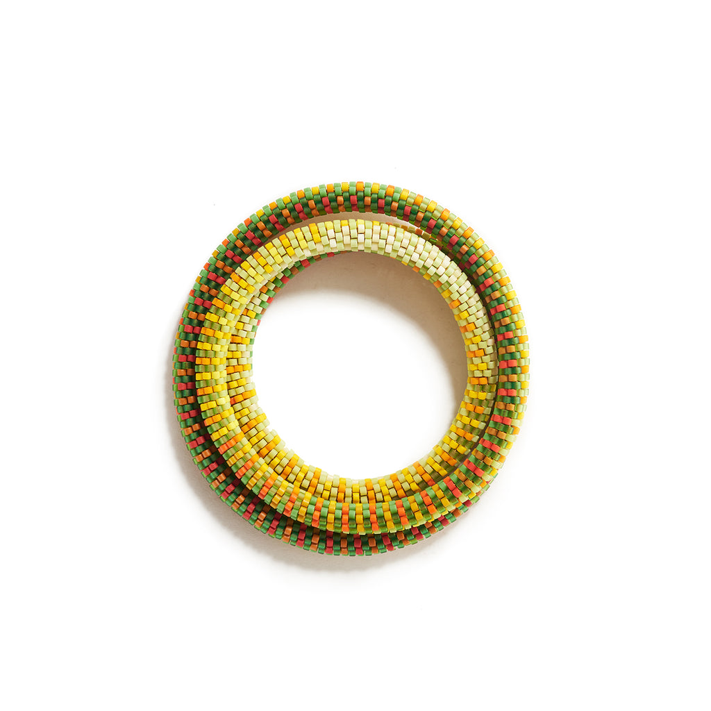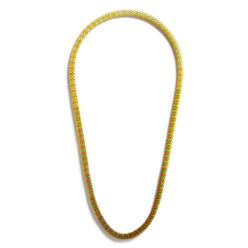 Bright, sunny beaded scales become an exotic and intriguing piece brilliantly through color and composition. Kahn creates a work in Lyda pattern as it transitions from light to dark with yellow, orange, red, green and mustard. Deep, saturated contrasts softly evolve into hushed progressions. Kahn unfolds a work of subtle dynamism that awakens the senses when worn. Either around the neck, or around the wrist, this is an exquisite piece for any soul-stirring engagement.