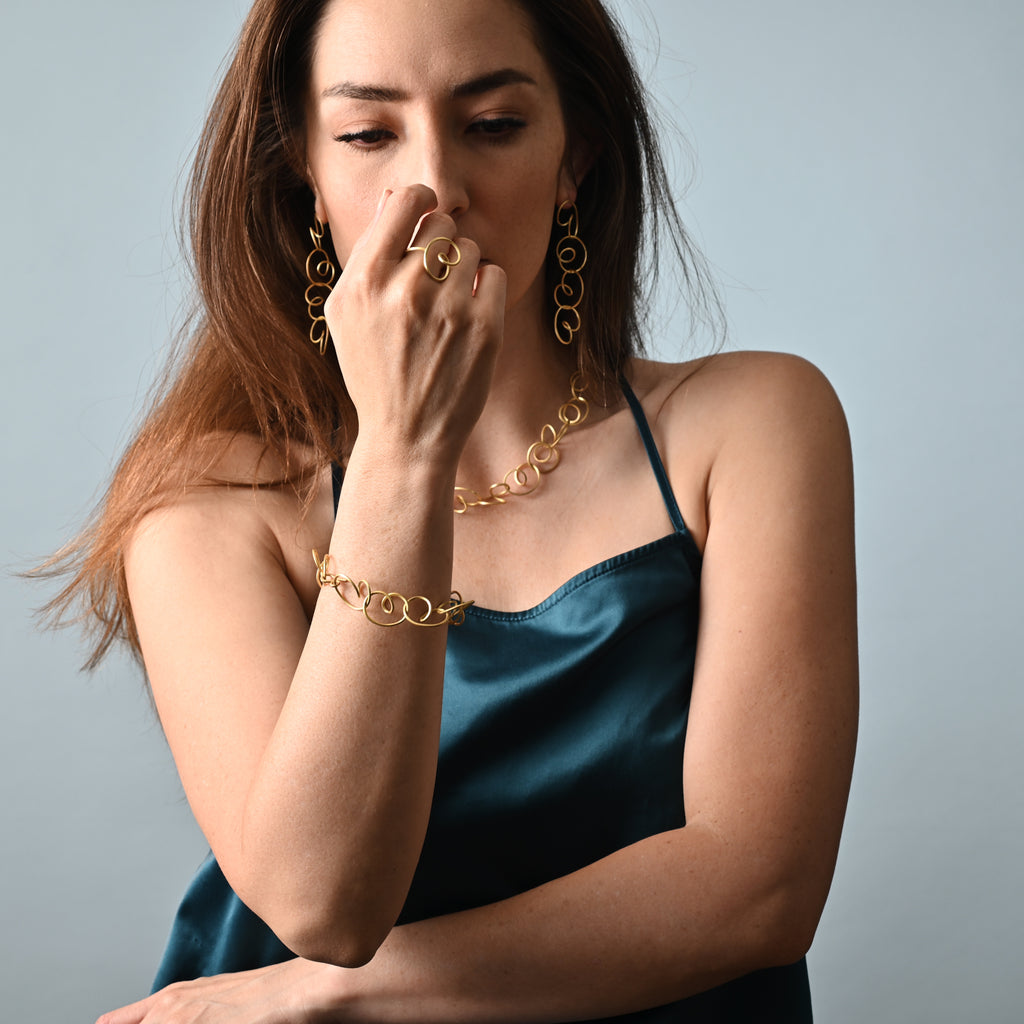 As shown with: Gargot Necklace ~ 42cm, Gargot Earrings ~ 65mm, and Gargot Bracelet ~ 18.5cm.