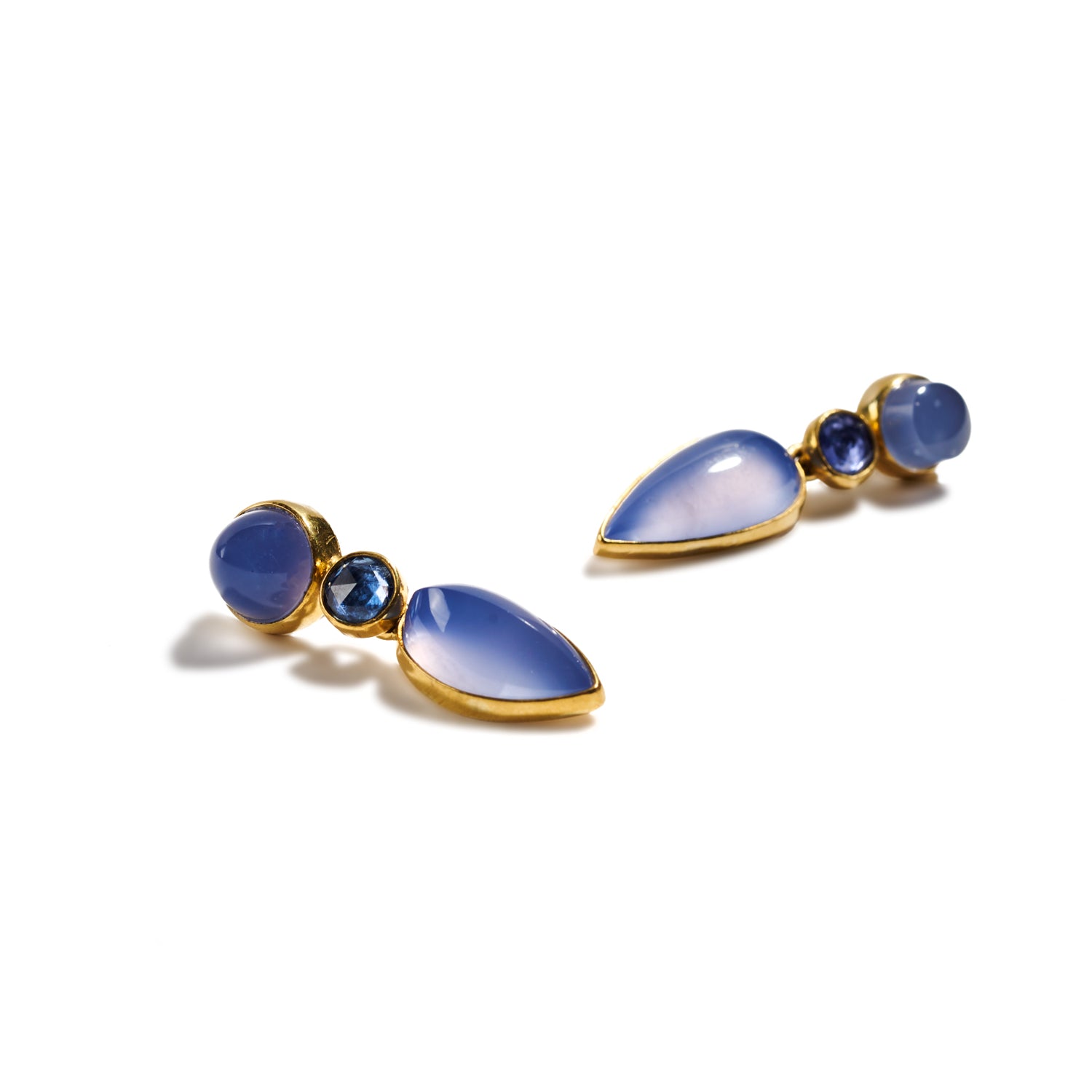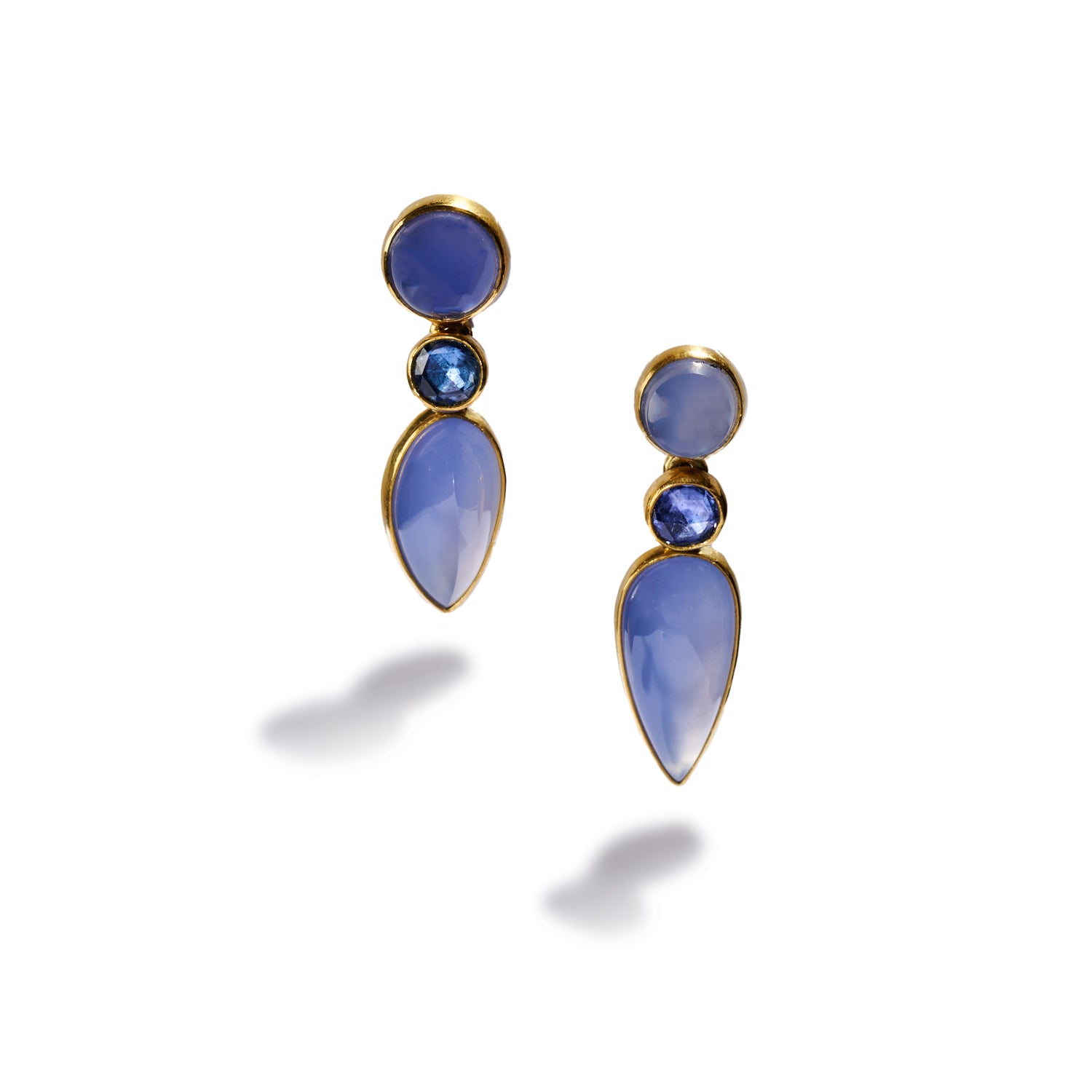 Across a deep plane of rich blue, the artists make a stunning statement for the ear as two bezel-set cabochon chalcedonies grace a bezel-set rose cut sapphire. Around their forms, the makers carefully endow their shape with high karat gold. As a brilliant work of art, it is nevertheless a comfort and near weightless fit once worn. These earrings gracefully swing from the ear, keeping the head of the work engaged.