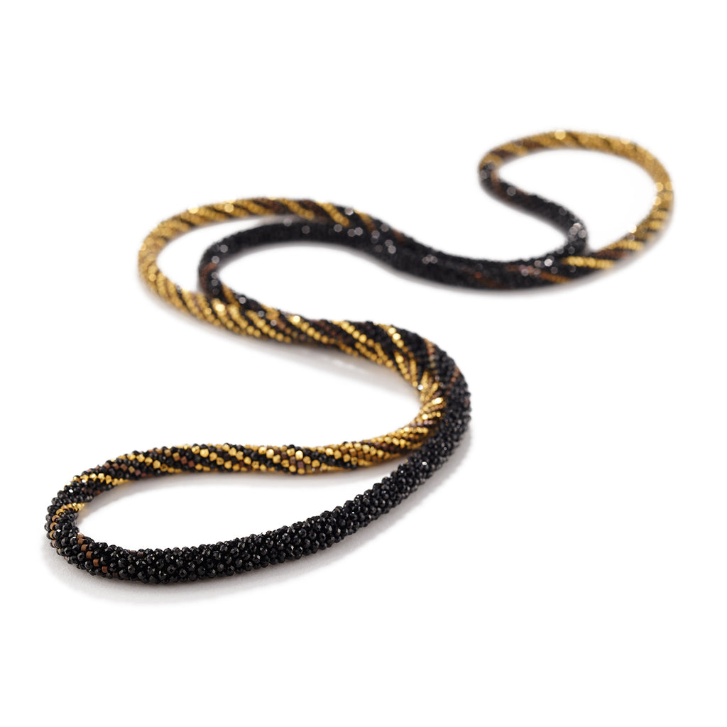 In a deep twist of rich, sparking contrasts, Kahn combines 18K gold and black spinel into an intoxicating web of cylindrical glass beads that transition from bronze to dark brown. Quite a soft, yet devastatingly glamorous statement to adorn. Perfect for the holiday season.