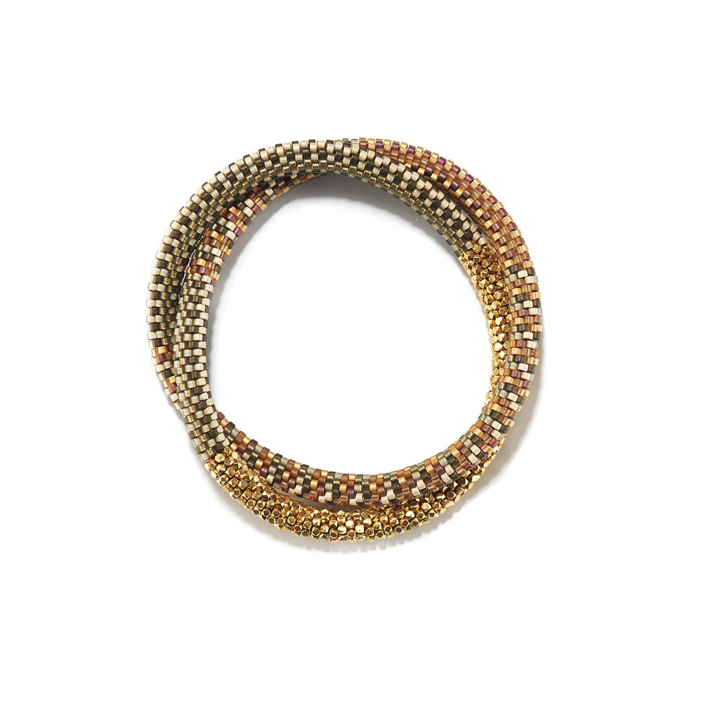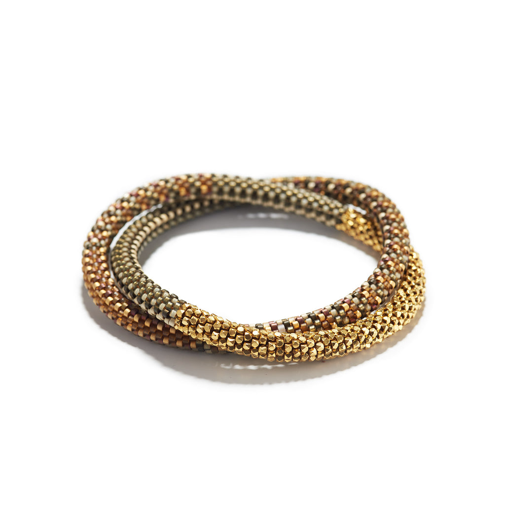 Blanket pattern in white, metallic gray, warm neutrals and gold with a 4" length of 18K faceted yellow gold bead crochet nuggets.