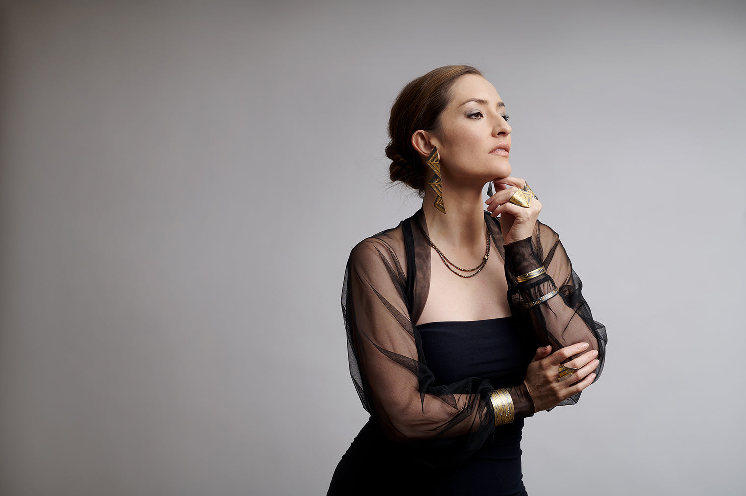 As shown with: Fused Gold Geometric Dangle Earrings, Raw Brown Diamond Beaded Necklace I, Raw Brown Diamond Beaded Necklace II, Overlapping Geometric Ring, Elongated Fused Gold & Sterling Ring, Wood Grain Cuff, Elongated Moonstone Ring, and Yellow Gold Waves Thin Cuff.