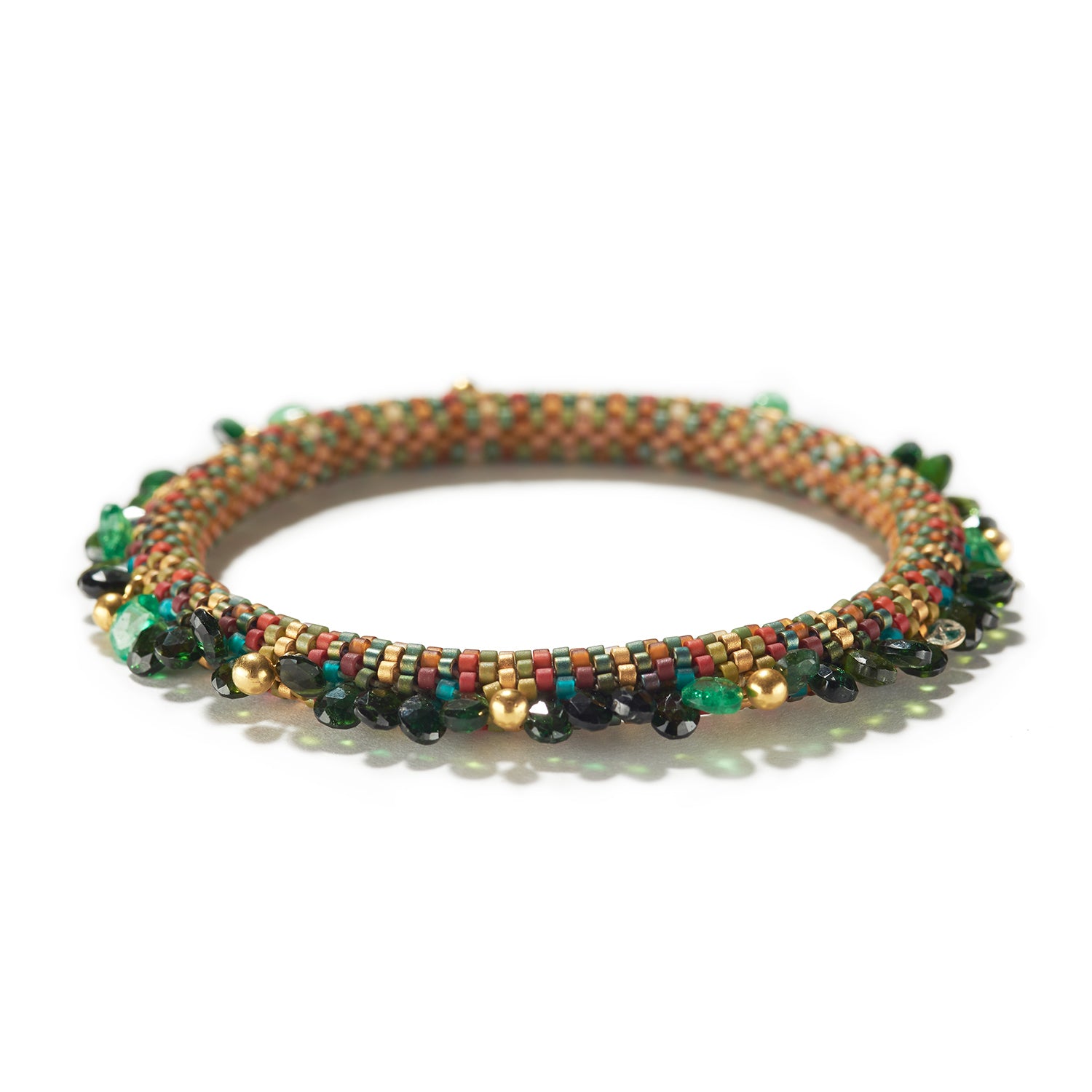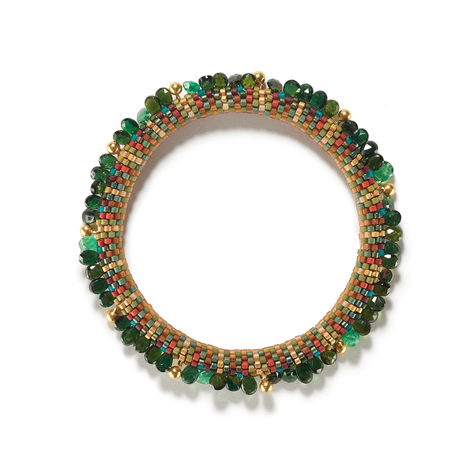 Festive colors are arranged in perfect symmetry to delight the eye. This Claire Kahn creation mixes chromium diopside and emerald briolettes with tiny gold ball charms. An exquisite and perfectly balanced work of art to adore and cherish.