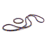 Claire Kahn brings together bright and dynamic beauty for the holiday season. Together she weaves cylindrical glass beads in progressions of gold, warm and cool blue, dark red, brown, and bronze. Around the perimeter, she imbues her work with a dense collection of faceted citrine, London blue topaz, garnet, and kyanite briolettes.