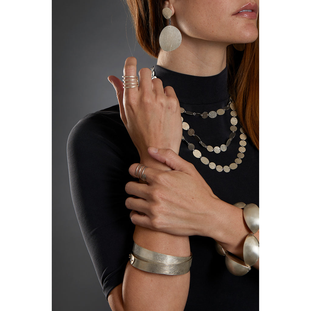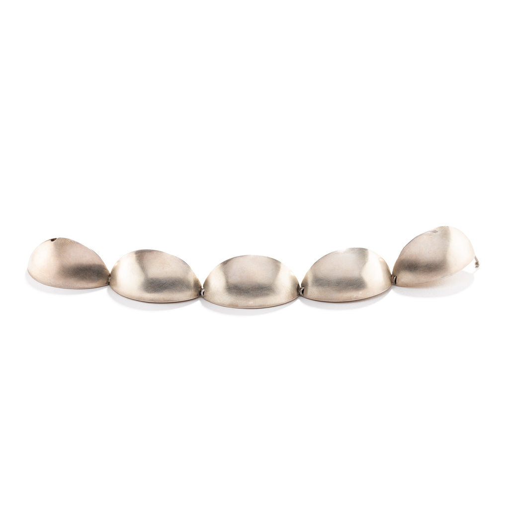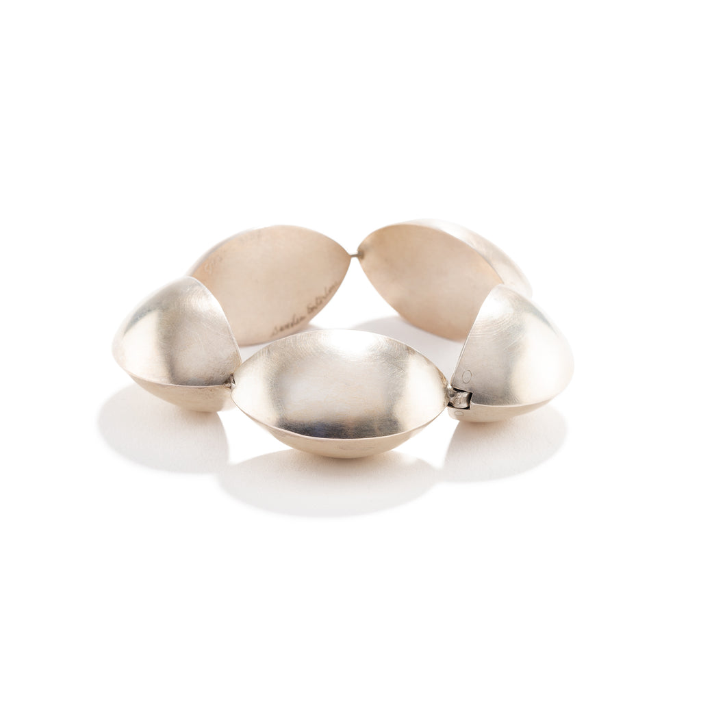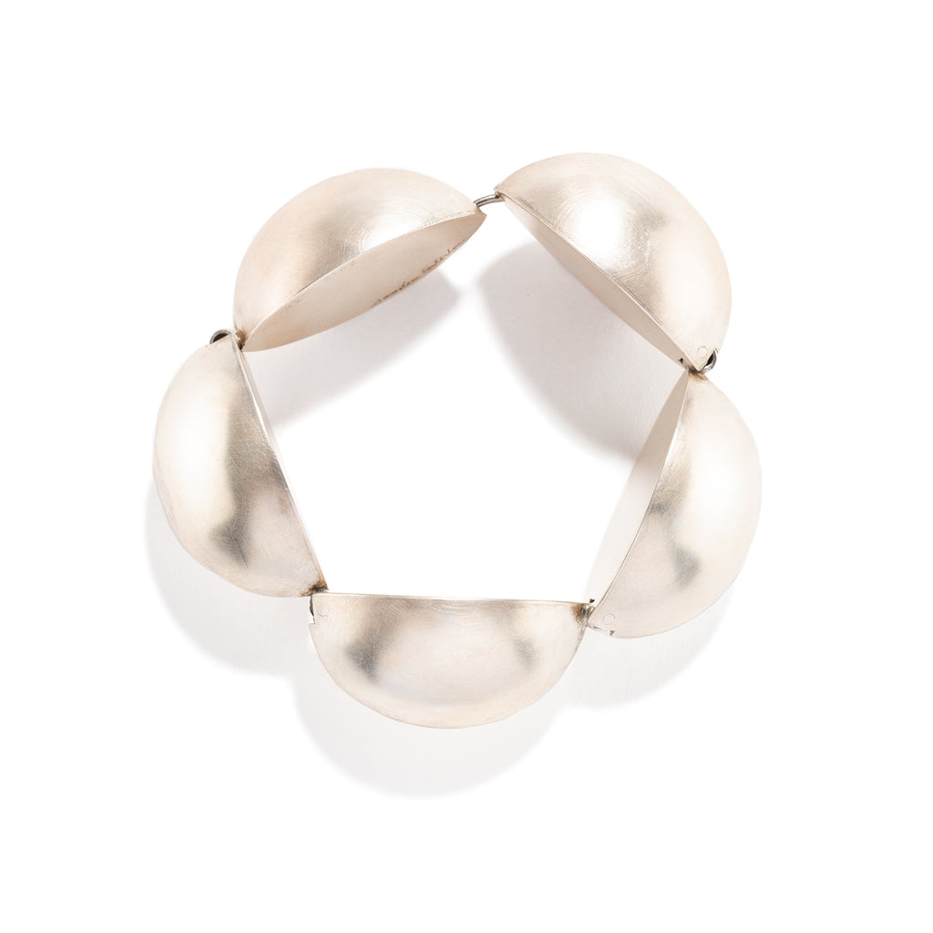 A bold statement piece. Each hollow form is hinged to form a pentagon on the wrist. The tongue in groove clasp disappears. A matte finish adds a luminous glow to the metal.